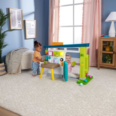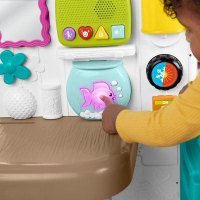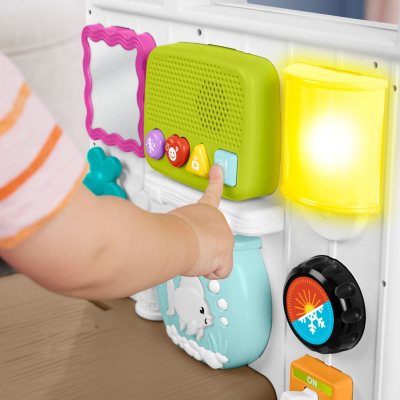 Crawl-around activity center with 200+ learning songs. 360 degrees of interactive play with 3 Smart Stages levels. L 36.3" x W 20" x H 33". Engaging and Fun Playhouse. The Laugh & Learn Ultimate Playhouse from Fisher-Price is a delightfully interactive playset. It's filled with engaging activities, illuminating lights, catchy songs, and entertaining sounds that will captivate both babies and toddlers. The exterior of the house is designed with a doorbell, porch light, shape-sorter window box, and a drop-through rain spout for an immersive play experience. Interactive Living Area. Step through the crawl-through door to enter the baby's living area. This space is equipped with a desk, a light-up fishbowl, a flower spinner, and a thermostat dial. It also includes a pretend radio with four buttons that activate fun music and sounds, providing endless fun for your little one. Smart Stages Technology. The Laugh & Learn Ultimate Playhouse is more than just a toy; it's a learning tool. It features Smart Stages technology, which adapts to your baby's growing abilities. This innovative technology offers over 200 fresh songs, sounds, and phrases, ensuring that the learning and fun never stop. Design Details. Please note that the colors and decorations of the Laugh & Learn Ultimate Playhouse may vary. Regardless of the color scheme, every detail is designed to stimulate your child's senses and promote cognitive development.