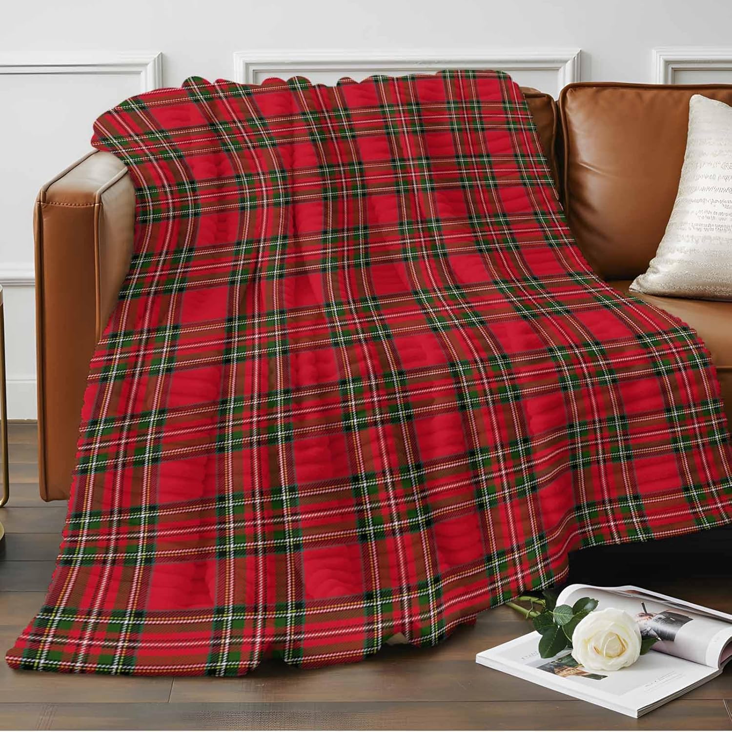 Fleece Throw Blanket for Couch,Winter Christmas Tartan Plaid Soft Cozy Plush Blankets with Stripe,Green Red Buffalo Checker Lightweight Flannel Throws Bed Blanket for All Season