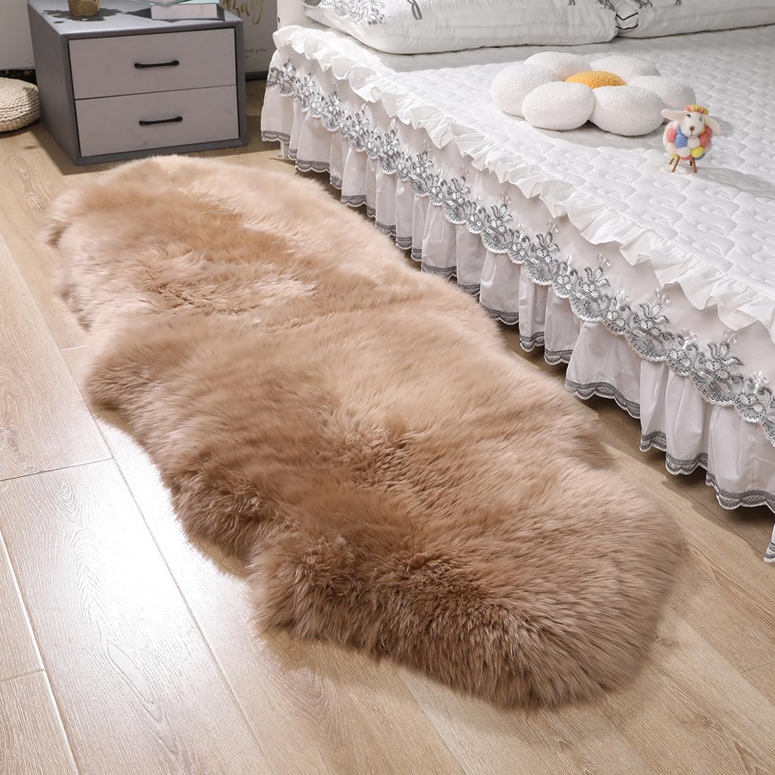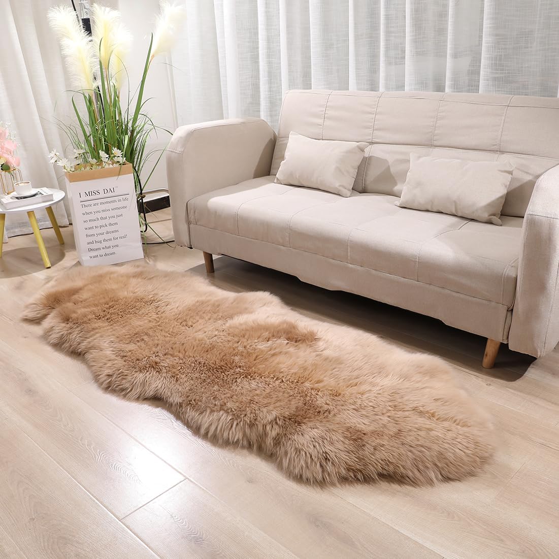 Fluffy Genuine Sheepskin Rug, Fuzzy Shaggy Fur Area Rug, Soft Fur Prayer Pup Mat Carpet, Chair Sofa Seat Cover, Bedroom, Living Room Double Pelts (Light Brown, 2x6ft)