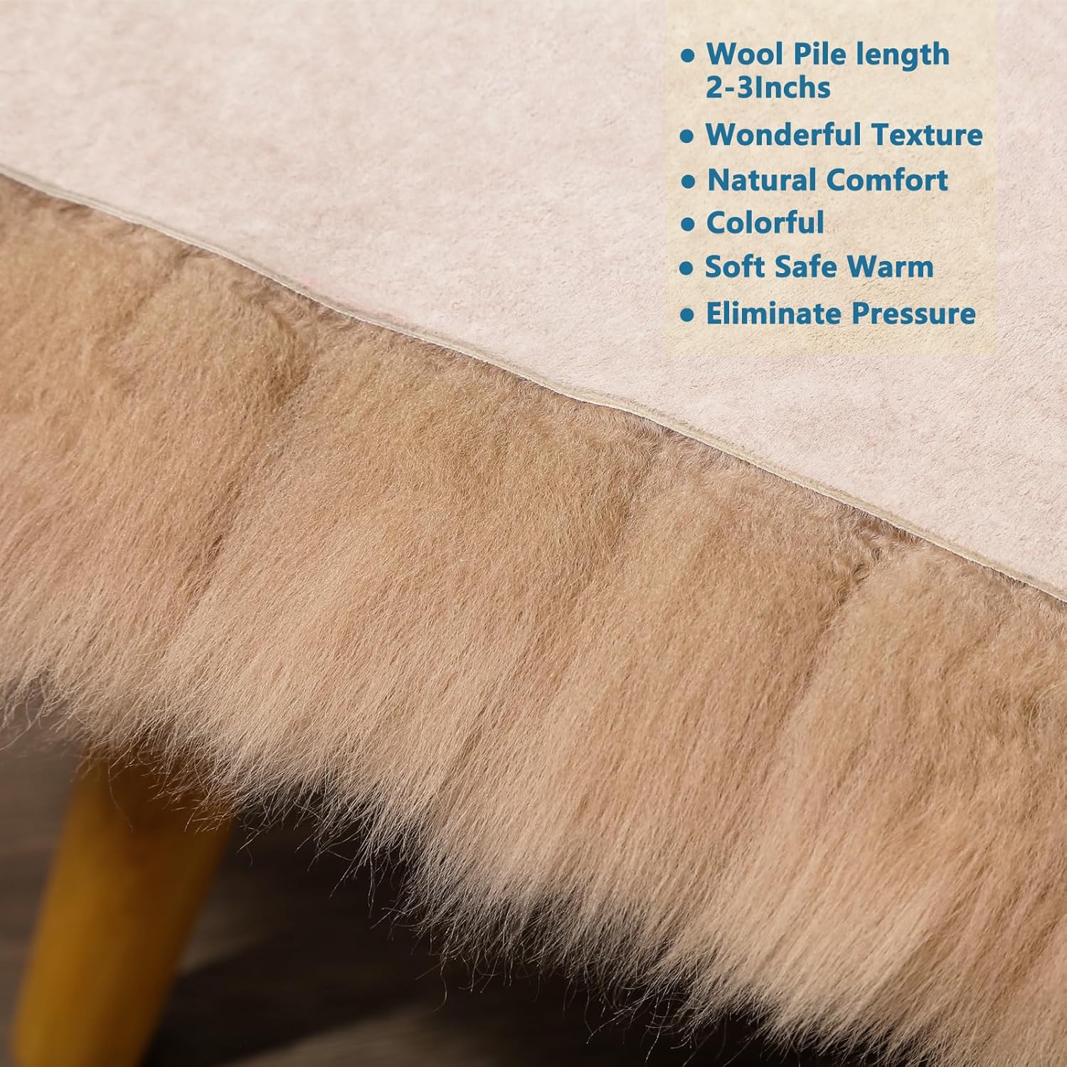 Wool length is 2-3Inchs, Generously sized pelt that measures at 3ft long or longer. Perfect size for placing in front of a chair or reading nook. Sheepskin rugs lend an easygoing elegance to seating—indoors and out.