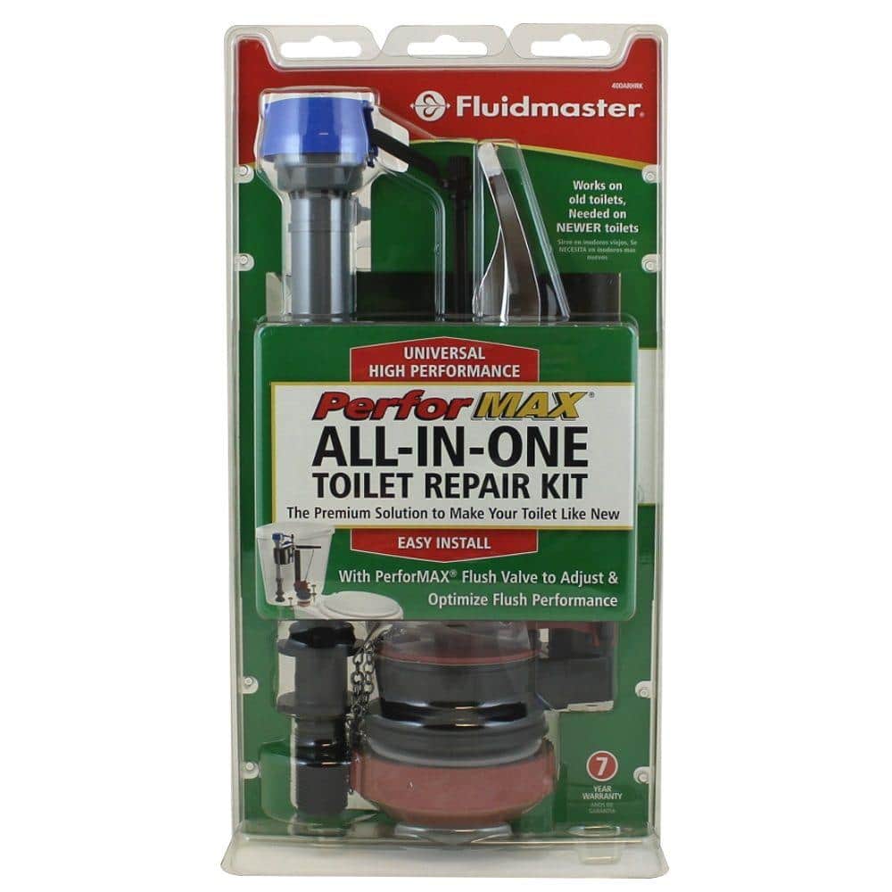 The Fluidmaster 400ARHRKP10 All-In-One Toilet Repair Kit offers the most premium solution and upgrade to enhance your toilet's performance. This toilet repair kit includes the PerforMAX Toilet Fill Valve for 2X greater refill rate, the 507AK PerforMAX 2 in. Flush Valve and Toilet Flapper to save water, a universal gasket, toilet handle, and hardware. An easy to install complete solution for most toilet problems that makes your toilet run like new. The universal design fits most toilets, while the included PerforMAX parts enhance and optimize performance. Replacement toilet parts all feature durable corrosion resistant materials. Save water and money with this high performance complete toilet repair kit. Note, toilet gasket may not be suitable for some Gerber or Kohler brand toilets. Everything needed to restore your toilet's performance. Fluidmaster universal toilet repair kit for 2 in. flapper toilets. A complete toilet repair kit made to fit and made to last. Solve common problems and limit water usage with the most premium all-in-one toilet repair kit. Easy to install universal design fits most toilets. PerforMAX Toilet Fill Valve adjusts easily between 10 in. - 15 in. Fits 2 in. flush valve toilets. Complete PerforMAX toilet repair kit replaces old parts and hardware to new. Effectively control fill and flush volume while upgrading toilet parts. Everything needed to restore and enhance your toilet's performance.