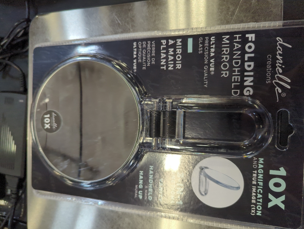 This double-sided Folding Hand Mirror features a 10x magnification side and a true image 1x side. Great for your home, office or travel, it is constructed of Ultra Vue optical precision quality glass.