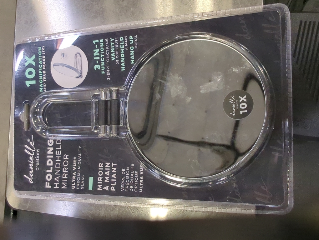 This double-sided Folding Hand Mirror features a 10x magnification side and a true image 1x side. Great for your home, office or travel, it is constructed of Ultra Vue optical precision quality glass.