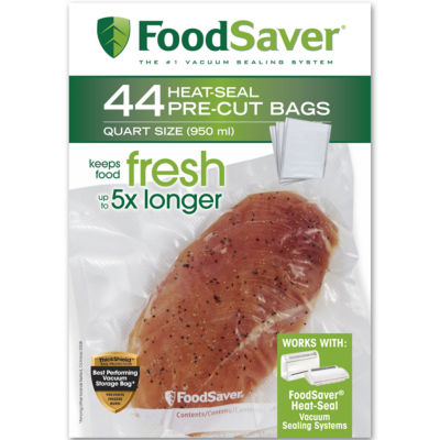 Seal in freshness and preserve food flavors with these heavy-duty multi-ply FoodSaver quart-size bags. Locks out air and moisture so dry goods and perishables remain freshMulti-ply construction prevents freezer burnBags are stovetop, microwave and freezer safeIncludes 44 one-quart 8x11" bags# Pieces In Set: 44Features: Microwave SafeWattage (watts): 10wMeasurements: 8 Length/Inches, 11 Width/InchesBase Material: 100% PlasticCare: DisposableCountry of Origin: Imported