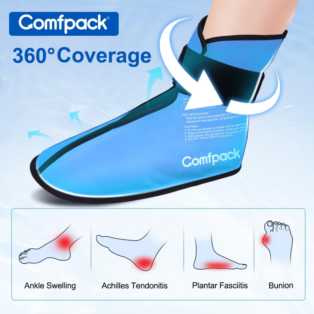 360° Foot & Ankle Pain Relief - This 2 packs Comfpack foot ankle ice pack wraps are specially designed to provide 360° cooling relief for ankle, heel, plantar, and toes, soothing pain from diabetic neuropathy, swelling after foot surgery, plantar fasciitis, sprain ankle, bunion surgery, sports injuries, inflammation, ankle fracture, achilles tendinitis, foot swelling.
