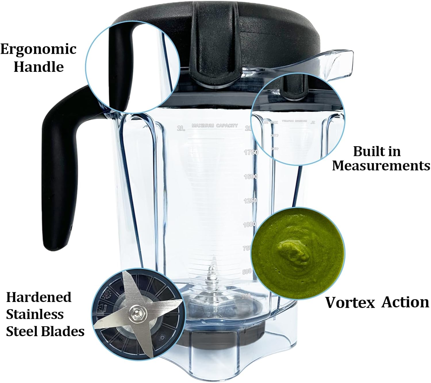 【Large Capacity】 This blender pitcher for Vitamix cna hold 2 Liters, ideal for large batches, suitable for household use and commercial use.