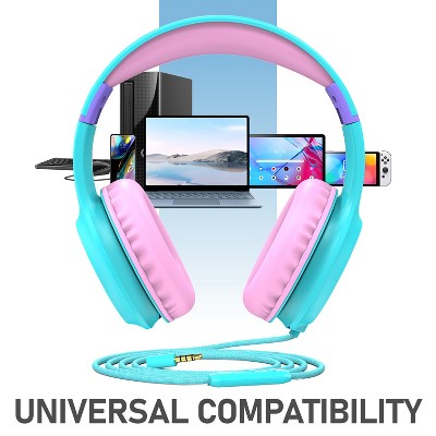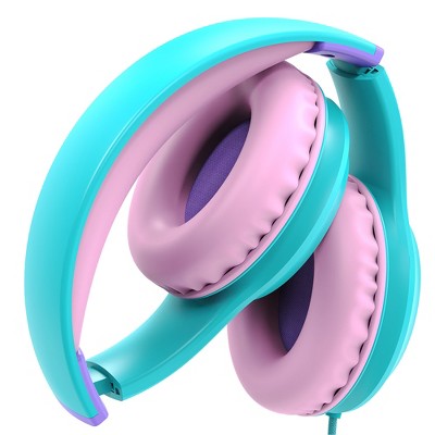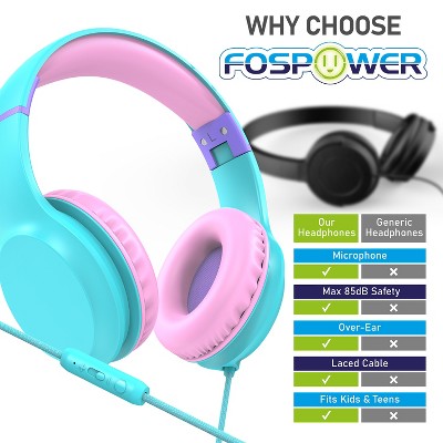 FosPower Wired Kids Headphones for School, Foldable Over Ear Headphones with Cord Microphone Mic, 3.5mm AUX Cable, Volume Control, Mint / Pink