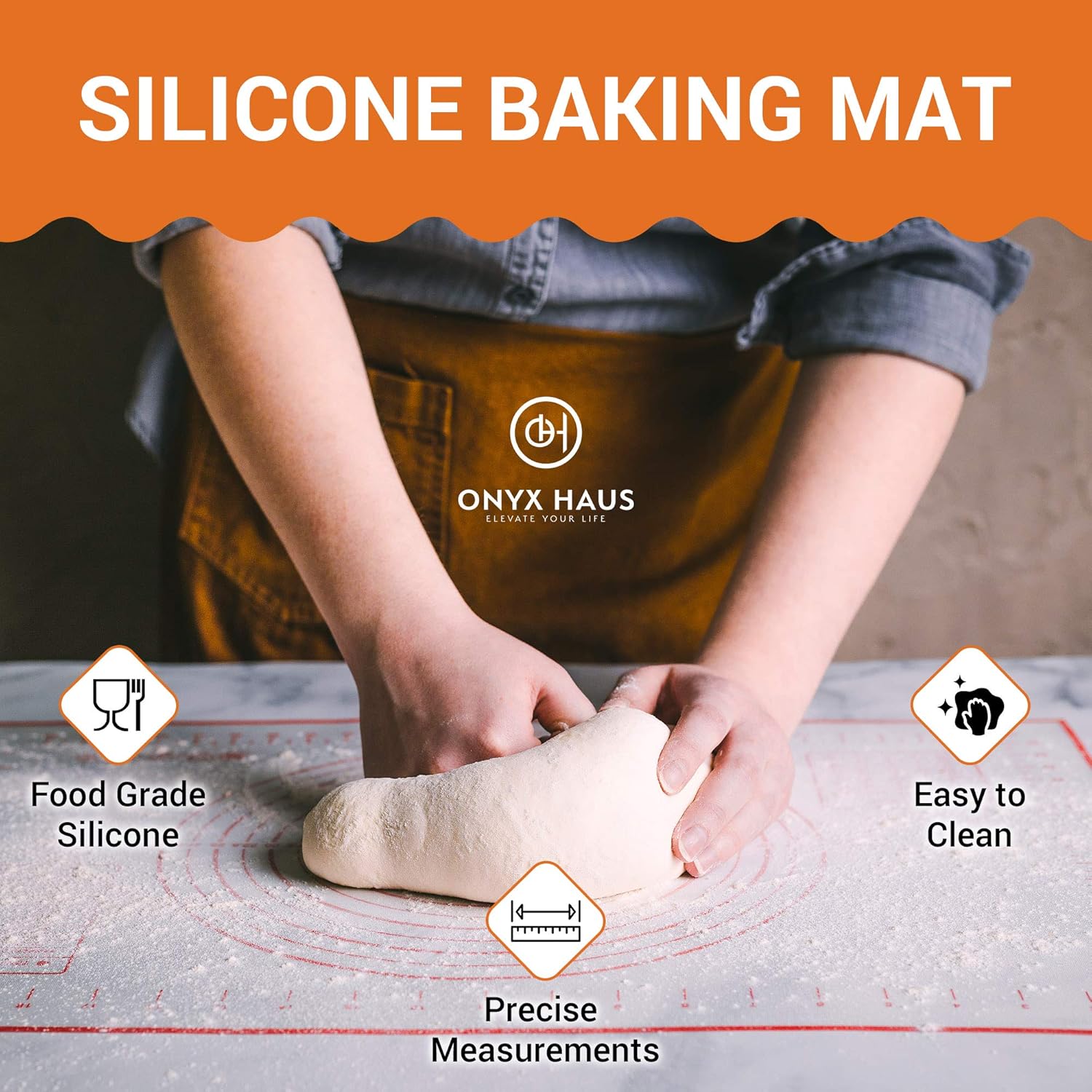 ???? SILICONE PASTRY MAT: Thick (.6mm) Food-Grade Nonstick surface with anti-slip bottom. Quality baking mat for rolling out dough. Has precise dimensions to make perfect measurements effortless. Bake bread, knead dough, make pizza, or cut pasta like a professional. Easy to clean and fold up for storage. Safe up to 450°. Size: 23.75 inch x 15.75 inch (60 cm x 40 cm)
