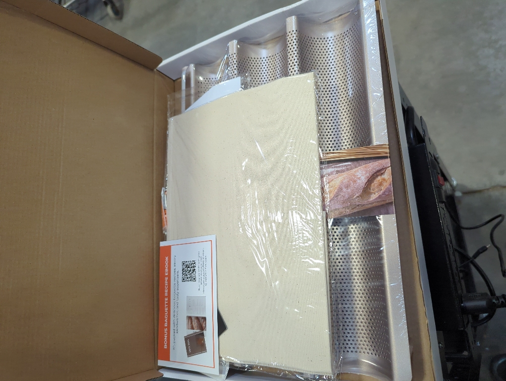 ????WHAT'S INCLUDED: 1 Carbon steel perforated nonstick baguette pan; 1 large silicone pastry mat; 2 scrapers: 4.5in (11cm) mini plastic bench scraper & 7.5in (19cm) plastic pastry scraper; large 17.75in x 29.5in (45cm x 75cm) 100% cotton bread couche (razor sharp bread scorer knife for expert scoring). Bonus: download free digital baguette recipe e-book with purchase. Great gift set of baking supplies!