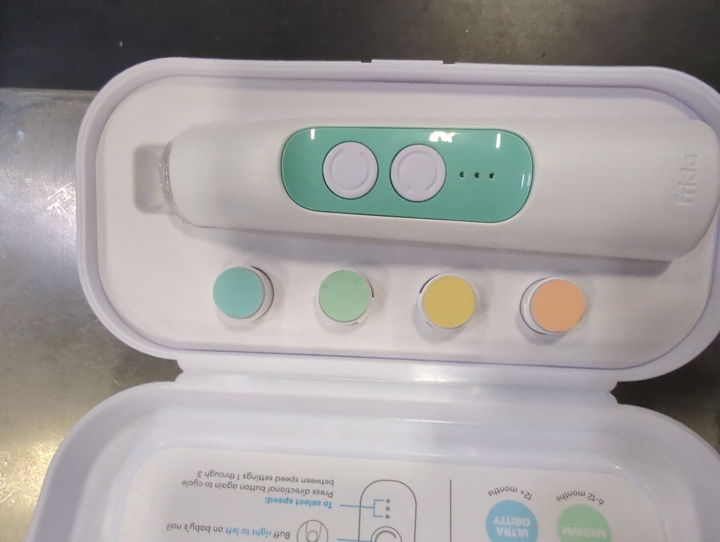 Frida Baby Electric Nail Buffer | Safe Easy Baby Nail File, Baby Nail Clippers Nail Trimmer Kit for Newborn, Toddler, Children's Fingernails/Toenails, 4 Buffer Pads, LED Light, Storage Case, White
