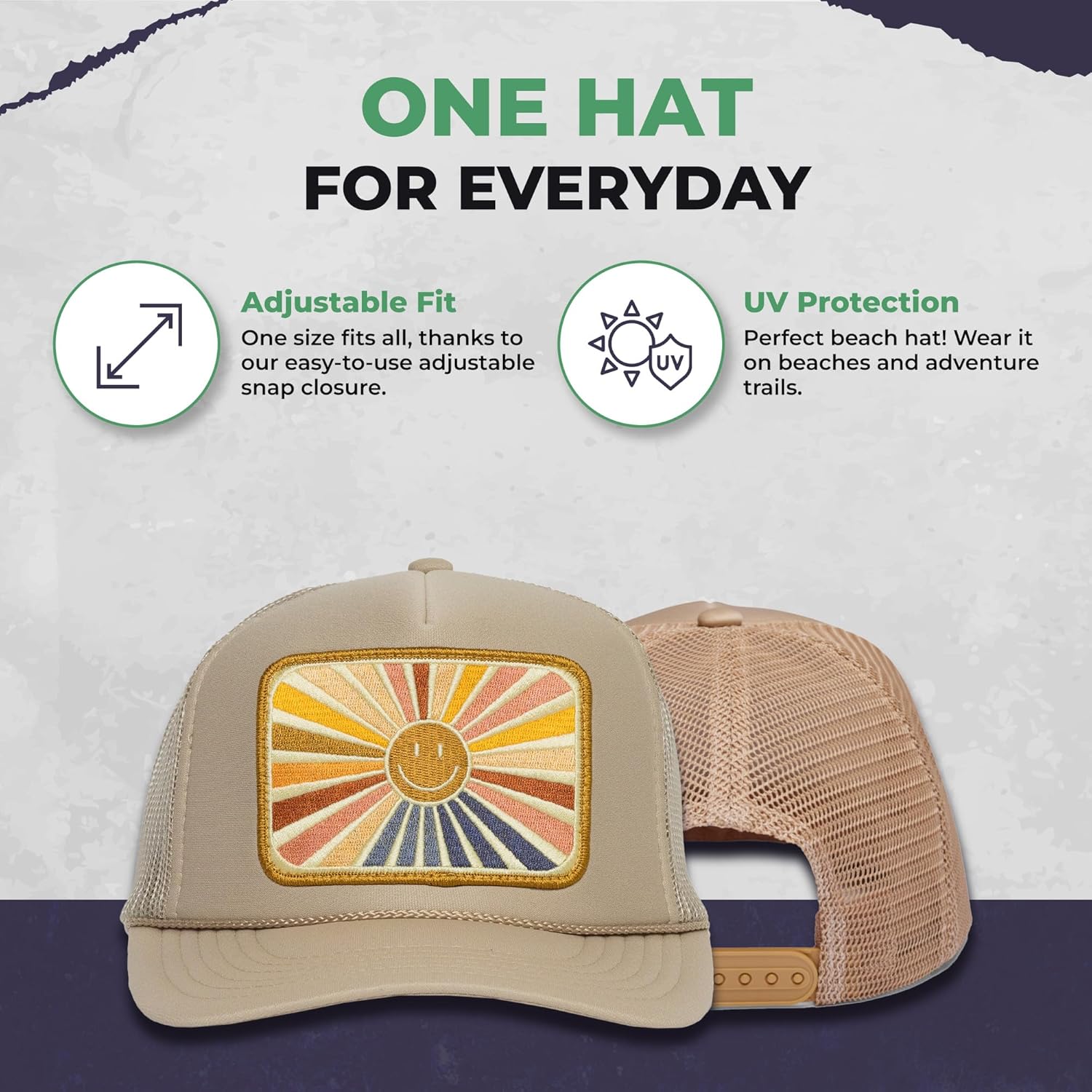 CUSTOM FIT: Our headwear brand, adjustable snapback trucker hats for men women is a perfect trendy hat fit. Womens trucker hat summer and men's trucker hats! These trendy baseball hats have great option as workout hats, have a day hat, women trucker cap, mens trucker hat, funny trucker hat, camo trucker hat, beer hat, cute trucker hat, best in outdoor activities athletics hats for men this trendy hat.
