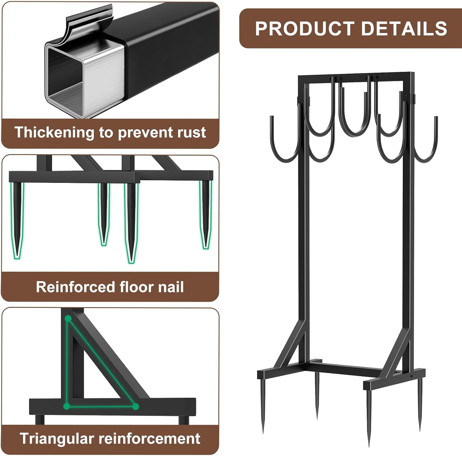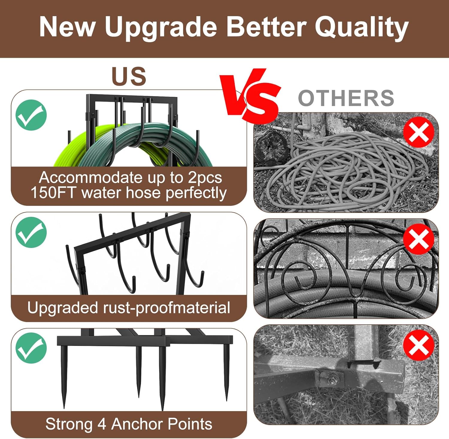 UPGRADED AND REINFORCED HOSE HOLDER: The Garden Hose Holder features a longer and thicker 4-peg design, double-pole rectangular stabilizing structure, and a reinforced base that prevents it from tilting or toppling over in the outdoors. Three upgrades enhance ruggedness and stability.