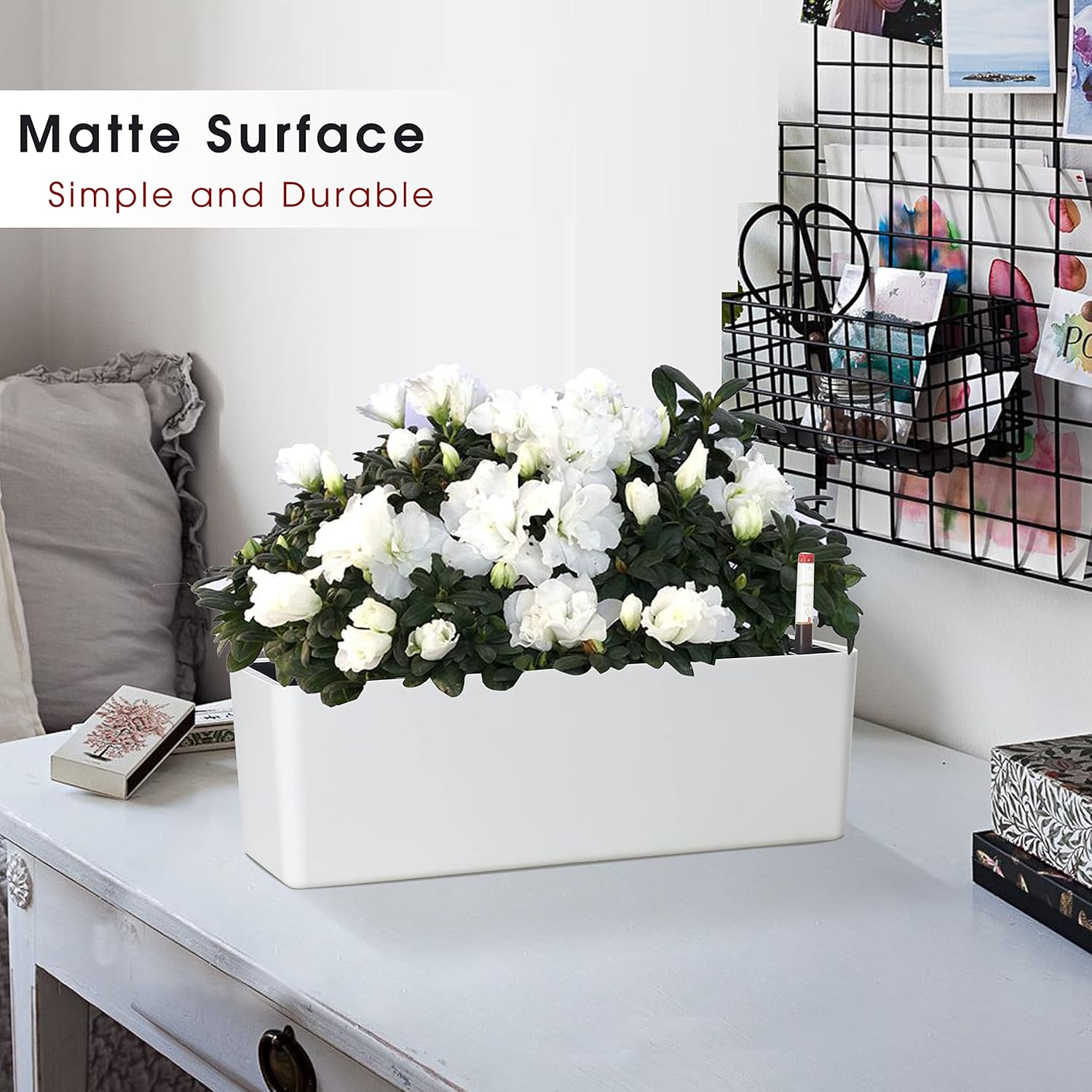 GardenBasix Elongated Self Watering Planter Pots 2-Pack Window Box 5.5 x 16 inch Indoor Home Garden Modern Decorative Planter Pot for All House Plants Flowers Herbs (White,2)