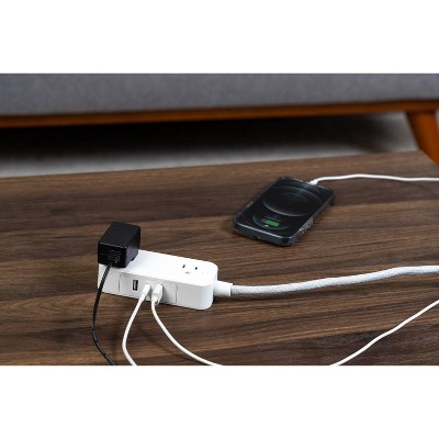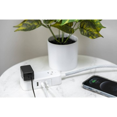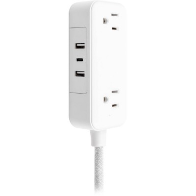 Power and charge your favorite electronics in style with a GE Extension Cord with USB Charging. Easily transform one outlet into an organized outlet extender with two USB-A charging ports, one USB-C charging port and two adapter-spaced grounded, three-prong outlets for the perfect home or office power hub. Power small household appliances, electronics and USB accessories while charging a laptop, tablet or other mobile device. This charging station’s 6ft. cord extends power to where you need it most, and the adapter-spaced outlets ensure there’s plenty of room to accommodate larger power adapters. While most indoor extension cords interrupt or distract from your room décor, this durable 6ft. braided power cord features a white and gray heather pattern, resists tangles and adds instant style to any space. Additionally, the power strip’s angled flat plug lets you insert it into a receptacle without blocking the other outlet. The flat plug’s low profile makes it perfect for use in tight spaces behind furniture kept close to the wall, such as a couch, desk or nightstand. Get the most from your outlet with a GE Extension Cord with USB Charging.