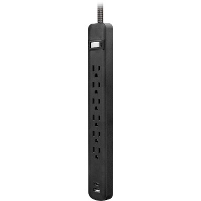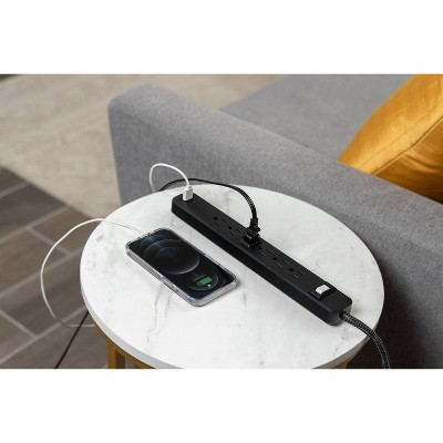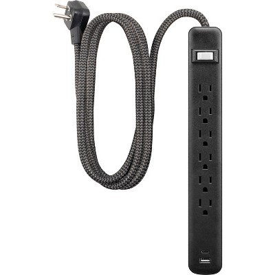 GE 6-Outlet Power Strip 1 USB-A 1 USB-C 15W Shared 6' Braided Cord Black