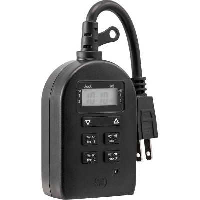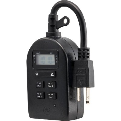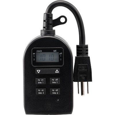 Simplify your routine with the GE-branded myTouchSmart SimpleSet Outdoor/Indoor Plug-in Digital Timer. The easy to program timer works with LED, CFL, incandescent and halogen bulbs, delivering convenient automation to your outdoor or indoor lighting. A grounded outlet supports a variety of plug-in devices. Whether you’re away for a few hours or a few weeks, the timer is a quick way to deter crime by giving your home a lived-in appearance. The outlet timer is ideal for varied routines, allowing you to set a unique schedule using up to two personalized my on/my off settings. Blue LED indicator lights show immediately which settings are activated. Suitable for year-round use, the weather-resistant construction withstands the elements. The grounded plug provides reliable, safe power from standard outlets. A built-in keyhole and mounting loop make hanging the timer near a GFCI outlet convenient. Set your life to ready with the GE-branded myTouchSmart SimpleSet Outdoor/Indoor Plug-in Digital Timer.