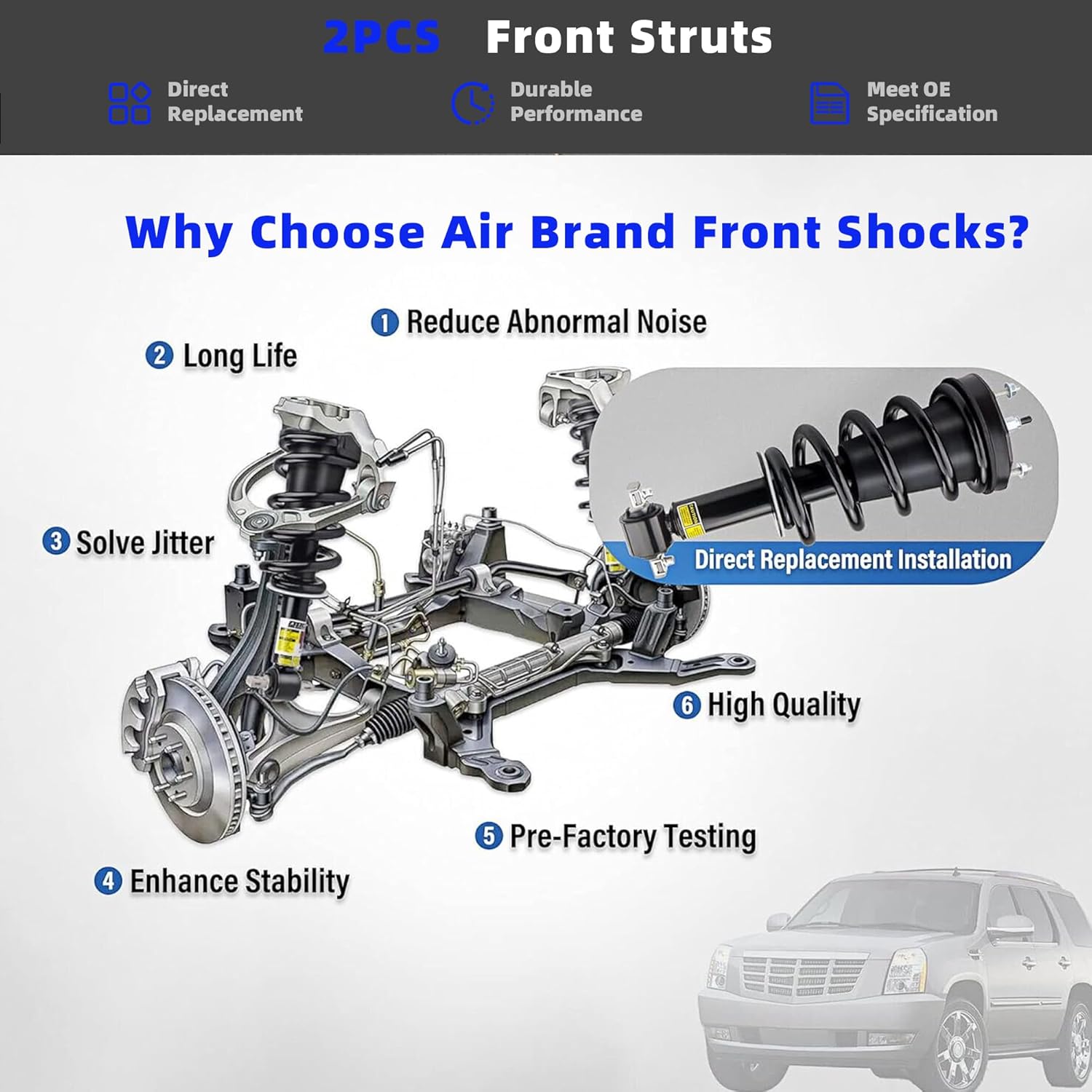 Perfect Fit The Front Struts are specifically designed for the Cadillac Escalade ESV Base (2015-2020), Chevy Suburban LS (2015-2020), Chevy Tahoe LS (2015-2020), and GMC Yukon XL Sierra 1500 (2015-2020), ensuring a seamless installation and optimal performance for your vehicle. OEM Replacement This Front Shock Assembly is a direct replacement for part numbers including 22283444, 23151123, 23312167, 23464589, 580-1032, 580-1108, 84061228, 84176631, 84977478, 75-22345, 75-877692B, 17522345-101, 17522345-102, 17522345-103, 17522345-104. High Quality Crafted from high-quality materials, these Front Struts deliver exceptional strength and longevity. The springs, made from chrome-silicon alloy, offer superior flexibility and increased stiffness, while the advanced tube and weld design ensure durability under various road conditions. Excellent Performance Featuring a magnetic-driven controlled suspension system similar to the original GM struts, these Front Shocks automatically adjust to changing road conditions. This technology enhances stability and control, while the integrated spring effectively absorbs road vibrations, ensuring a smooth and comfortable ride for both driver and passengers. Easy installation Designed to meet OEM specifications, these Front Struts and Shocks feature identical installation dimensions and interfaces as the original parts, making the replacement process quick and hassle-free.
