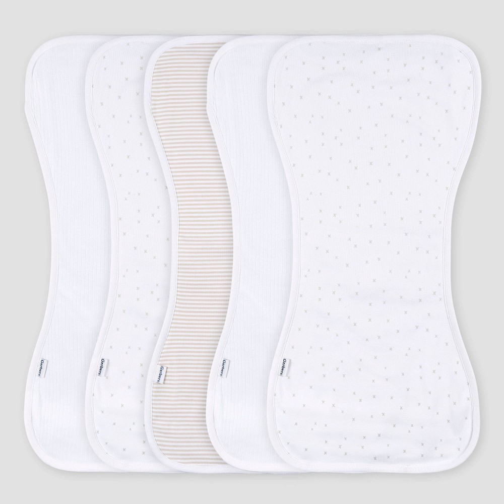 This pack of 5 burp cloths keeps outfits clean during post-meal cuddles. Soft cotton is gentle on baby's skin. Neutral colors and easy to use as a small changing pad. Perfect for use at home and on the go.