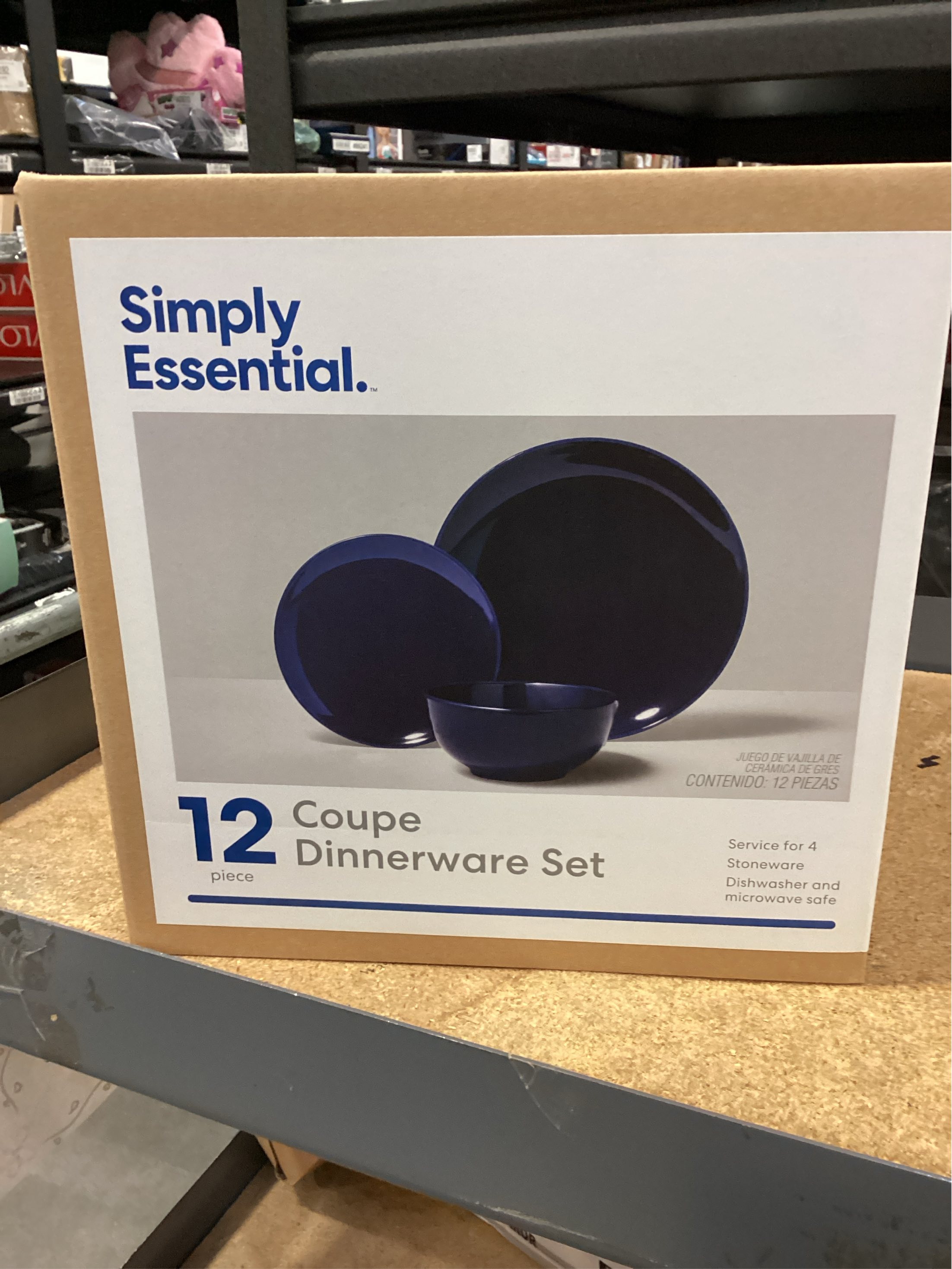 Liven up the dinning table with the Simply Essential Coupe 12-Piece Round Stoneware Dinnerware Set. The complete set features a vibrantly colored glossy glaze over a minimalist round body shape. Thanks to the stoneware body the set is dishwasher safe and microwave safe. Throw an unforgettable dinner party or brighten your everyday home cooked meals.. Material: stoneware. Finish: glossy. Color: navy. Shape: round. Dishwasher Safe. Microwave safe. Set includes: four 10.25 in. dinner plates, four 7.25 in. dessert plates, four 6 in. bowls. Cleaning Instructions: No special cleaning required. Color Family: Blue. Color/Finish: Navy. Features: Dishwasher Safe,Microwave Safe. Included: Bowl,Dessert Plate,Dinner Plate. Intended Use: Residential. Kitchen Product Type: Dinnerware Sets. Material: Stoneware. Number of Pieces: 12. Occasion: Year Round. Package Type: Assorted Set. Recommended Use: Casual. Service Set For: Set for 4. Shape: Round. Style: Casual