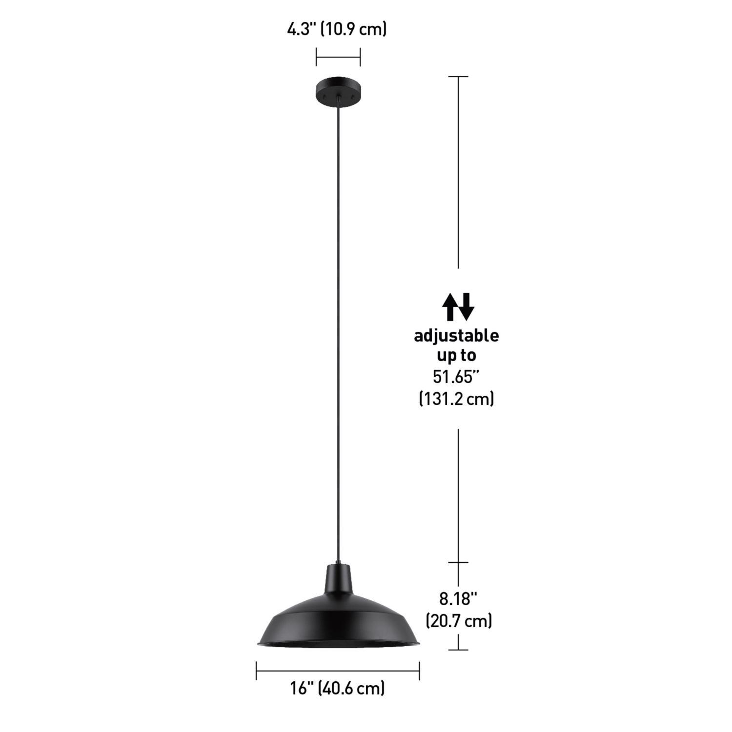 With its matte black finish and modern profile, the Globe Electric's Barnyard 1-Light 16 in. Industrial Warehouse Pendant emits a cool, practical presence, like those found in large warehouses, artists' lofts or retro-style barber shops. Made of durable metal, the transitional-style shade offers a clean, casual look and general all-over room lighting. Use it anywhere from over the kitchen table or bar to above a sitting area in the living room or in a workshop, game room or studio. The light comes with a 5-foot cord for easy hanging installation.