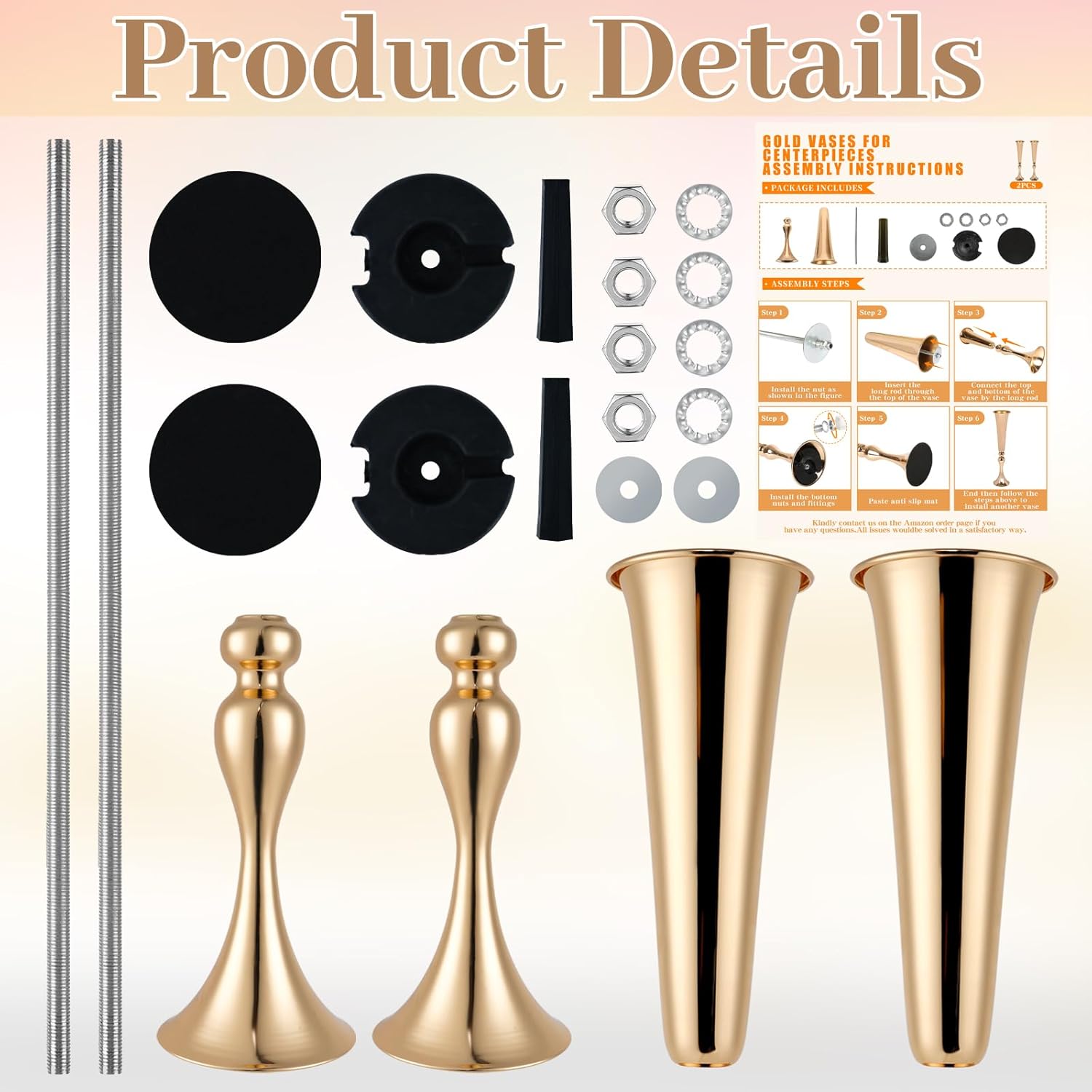 Assembly Required: 2 metal vases for centerpieces are divided in different parts for transportation safety. Just take few minutes to assemble them together according ASSEMBLY INSTRUCTION included and the assembling video shown after images