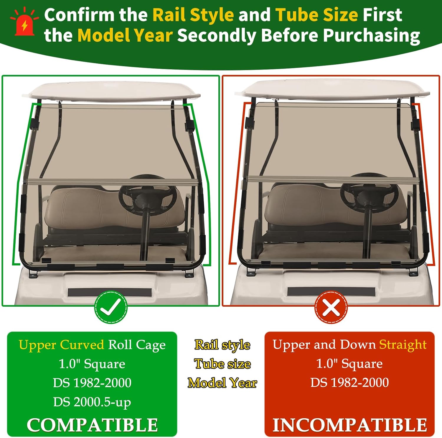 PERFECT FITMENT: The golf cart windshield ONLY FITS 1982-Up Club Car DS gas & electric golf cart and ONLY FITS 1.0" strut top tapered or curved rail style. (NOTE: Confirm the Rail Style and Tube Size First, the Model Year Secondly before purchasing, the windshield Not Fit Front Straight Up Rail Style)