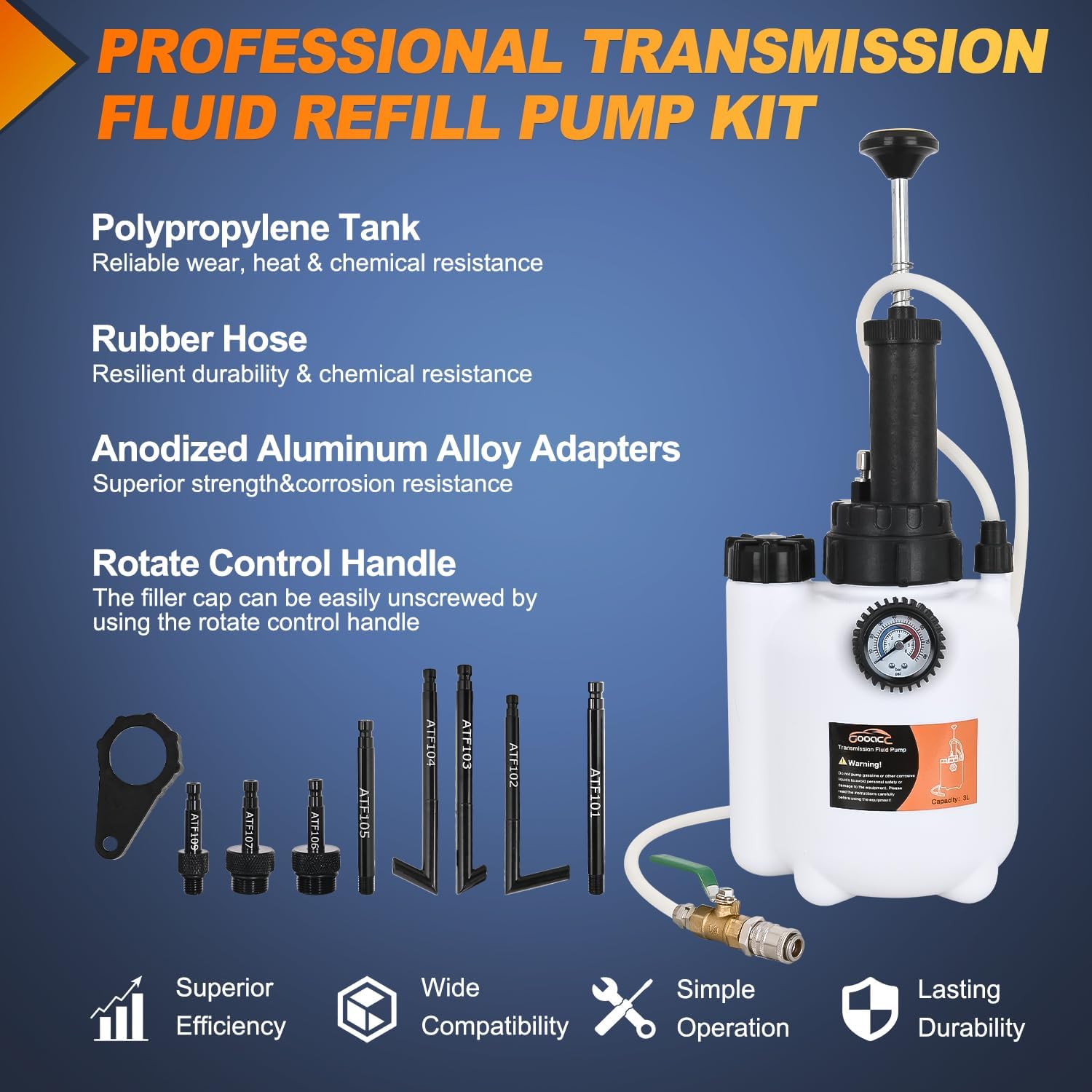 EASY TO USE: After adding fresh oil to the container, select the appropriate adapter and connect the hose. After draining the waste oil, manually pressurize the oil filling pump to allow new oil to flow into the transmission automatically. When completed, press the pressure relief valve to release the pressure. The included Rotate Control Handle allows you to easily open or tighten the oil filling port. GOOACC transmission oil pump allows for an easy and smooth extraction process that can be operated by one person.