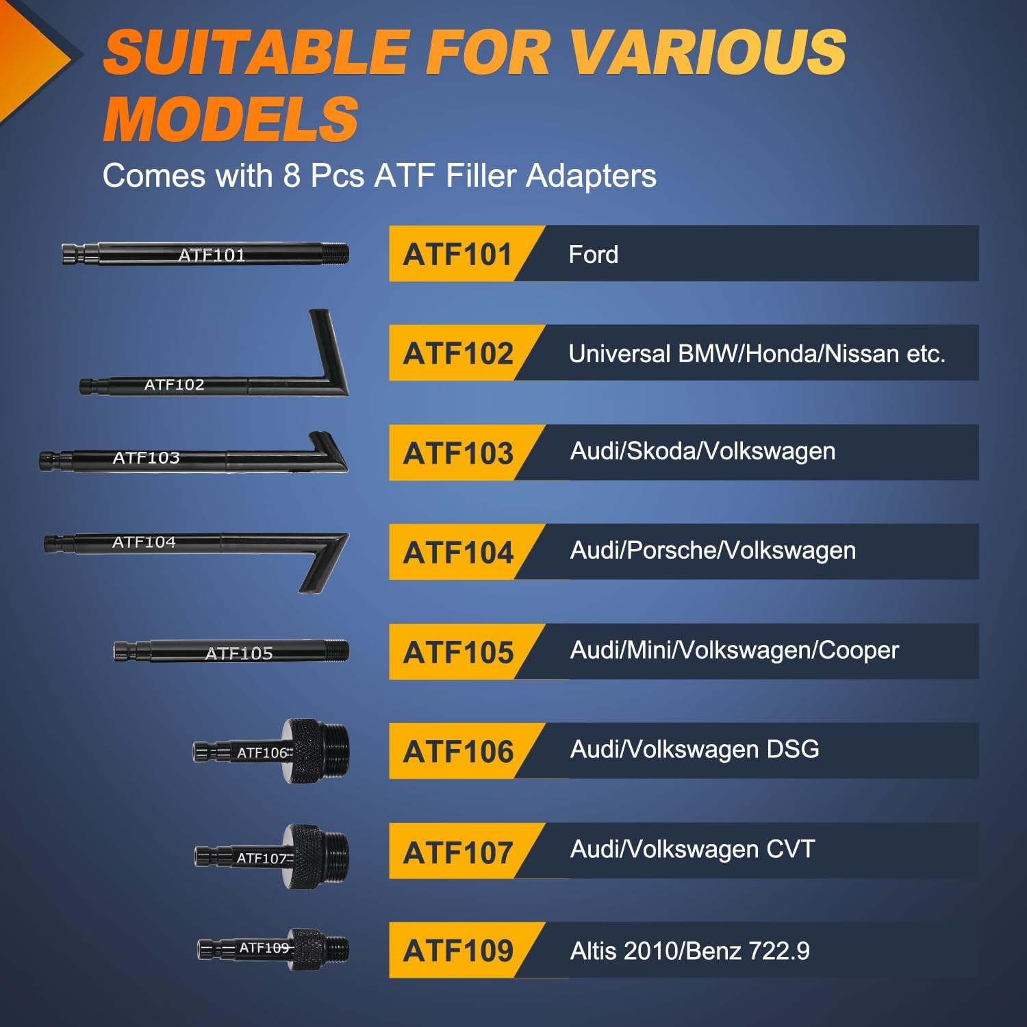 UNIVERSAL COMPATIBILITY: GOOACC manual transmission fluid vacuum transfer pump comes with 8 Pcs ATF refill adapters with marked NO. Widely compatible with Ford/ BMW/ Honda/ Nissan/ Porsche and most cars.