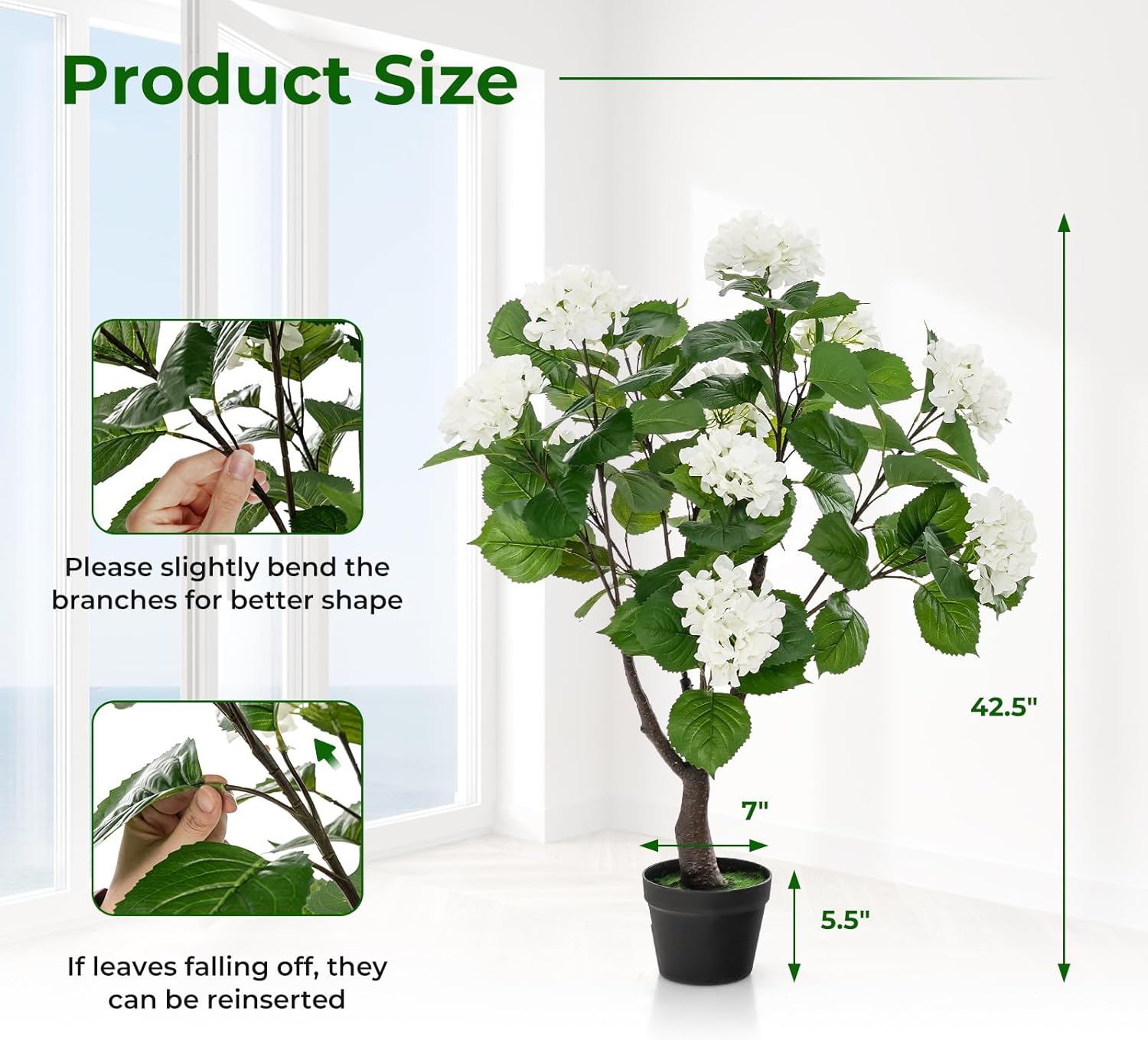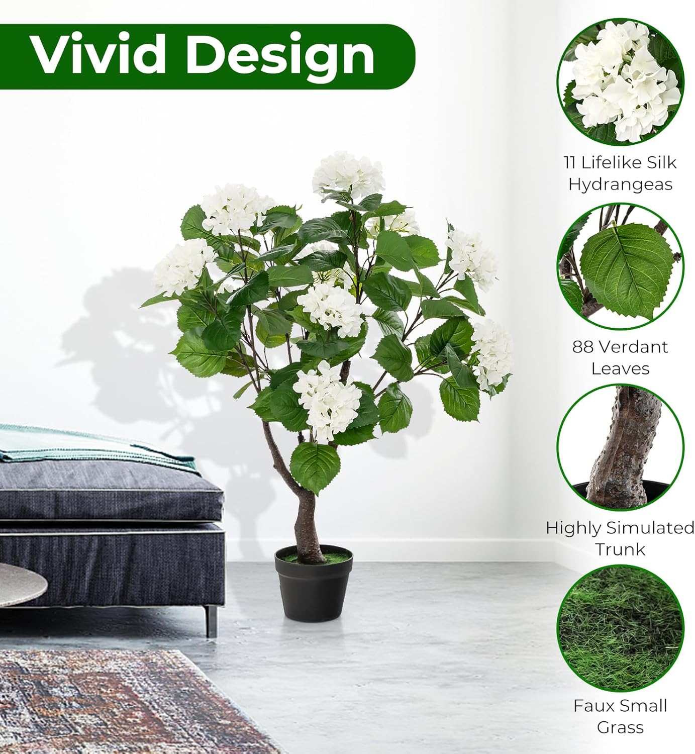 Infuse Vitality to Your Space: Equipped with 11 lifelike hydrangea flowers, 88 lush verdant leaves and simulated trunks, this artificial flower tree highly mirrors the beauty and vitality of a real hydrangea tree. The flowerpot is even adorned with faux grass, providing an added touch of vigour.