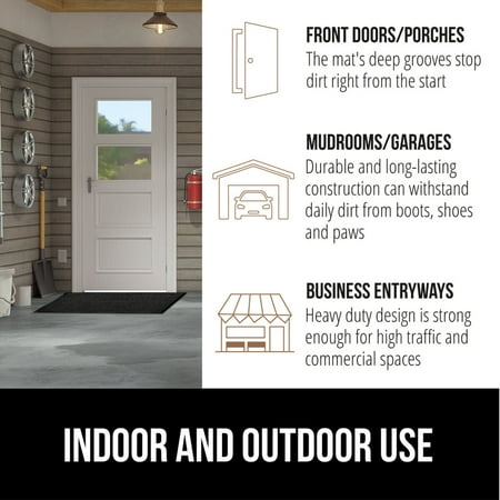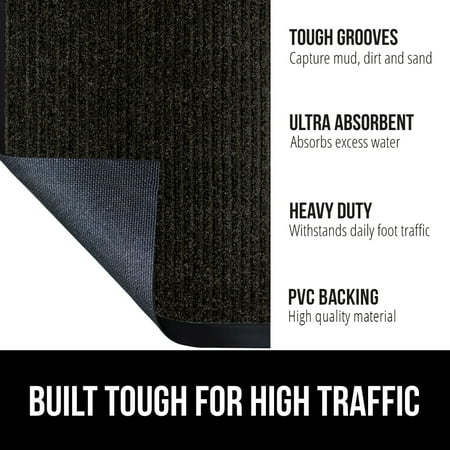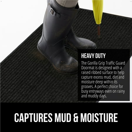 BUILT TOUGH FOR HIGH TRAFFIC: the Gorilla Grip Traffic Guard doormat is ultra strong and built tough to withstand high foot traffic; constructed with a high quality textured PVC backing and raised fabric topside to help scrape off dirt and debris; thick and plush topside is gentle on bare feet, but durable for boots WATERPROOF RIBBED TOPSIDE: ultra absorbent and 100% waterproof, the mat's surface helps to capture excess water and moisture; plus, premium fabric dries quickly and resists staining and fading for long lasting use DEEP GROOVES CAPTURE MUD AND MOISTURE: designed with a raised ribbed surface to help capture mud, dirt, moisture and debris deep within its grooves; perfect for those rainy and muddy days LOW PROFILE EASILY CLEARS DOORS: mat's low profile design measuring .25 inches thick allows nearly any low clearing door to pass over with ease INDOOR AND OUTDOOR USE: a great option for both indoors or out; mat's are extremely durable and can be used in a variety of locations at home or at work such as entryways, porches, patios, mudrooms, garages, and more