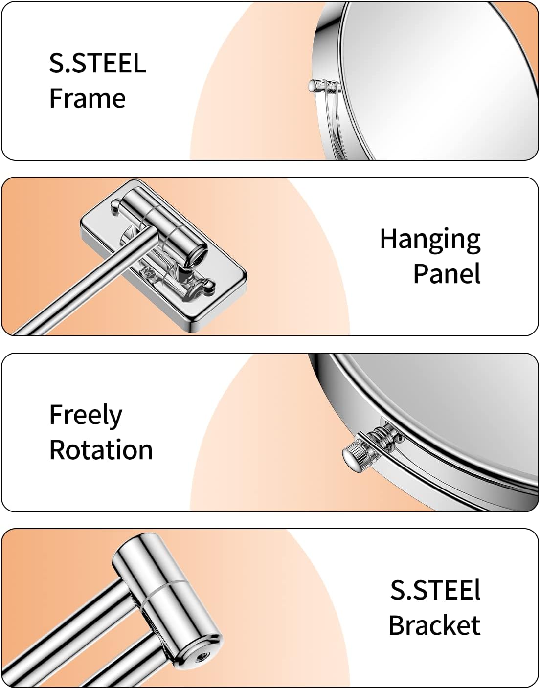 [10X/1X Dual-Sided MAGNIFICATION] : This wall-mounted mirror is double-sided design, the 1X side is designed for overall look. The 10X magnification side is suitable for detailed makeup, shave, comb your hair, etc. (The magnifying side uses a short-focus convex lens. For a clear, enlarged view of facial details, hold them within 4 inches. )