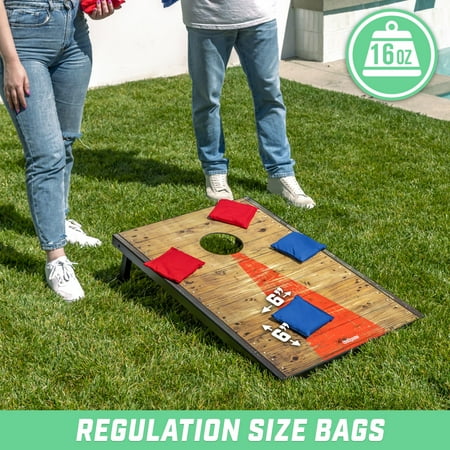 Official regulation corn hole toss replacement bean bags Premium quality bags are double stitched for durability 8 classic colored bean bags (4 red 4 blue) and heavy duty tote bag for easy storage and transportation Bean bags made from hardy and durable duck cloth with plastic pellet fill (ideal all-weather filling) This set is perfect for tailgate parties, BBQs, cookouts, and a great addition to any cornhole set Color: Red and blue Dimensions (L x W x H): 6 x 6 inches Weight: 16 ounces each
