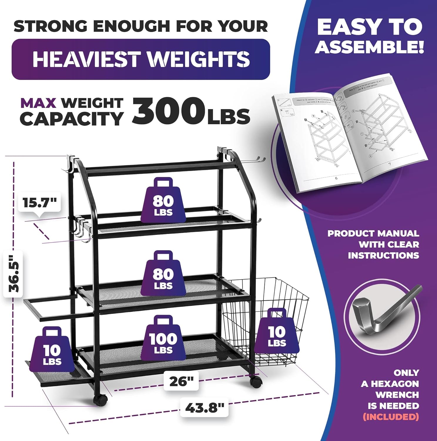 EASY STORAGE FOR EVERYTHING EXERCISE: From kettlebells to foam rollers, dumbbells to resistance bands, jump ropes to yoga mats, this versatile, heavy-duty workout equipment storage solution gives you a convenient spot to store everything you need for exercise. Easily assembled with just one hexagon wrench and holding up to 300 pounds for gym equipment storage, this home gym storage organizer can help you bring order to your home gym chaos.