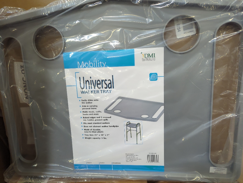 This convenient carrying tray, made of durable easy-to-clean, is a great accessory for your walker. It slides over the handles of most standard walkers without obstructing the hand grips. It makes it easy to hold meals, crafts, personal items, reading materials, your phone or whatever you like. The two cup holders give you room to hold drinks. The raised edges will help you avoid spills. Use it to take meals from the kitchen or to your table from a restaurant buffet. It's also helpful around the house for carrying things from one room to another. See measurements to make sure it will fit your walker.. Tray attaches to most standard walkers. Holds meals, crafts, reading materials, etc. Raised edge prevents spills. 2 recessed cup holders