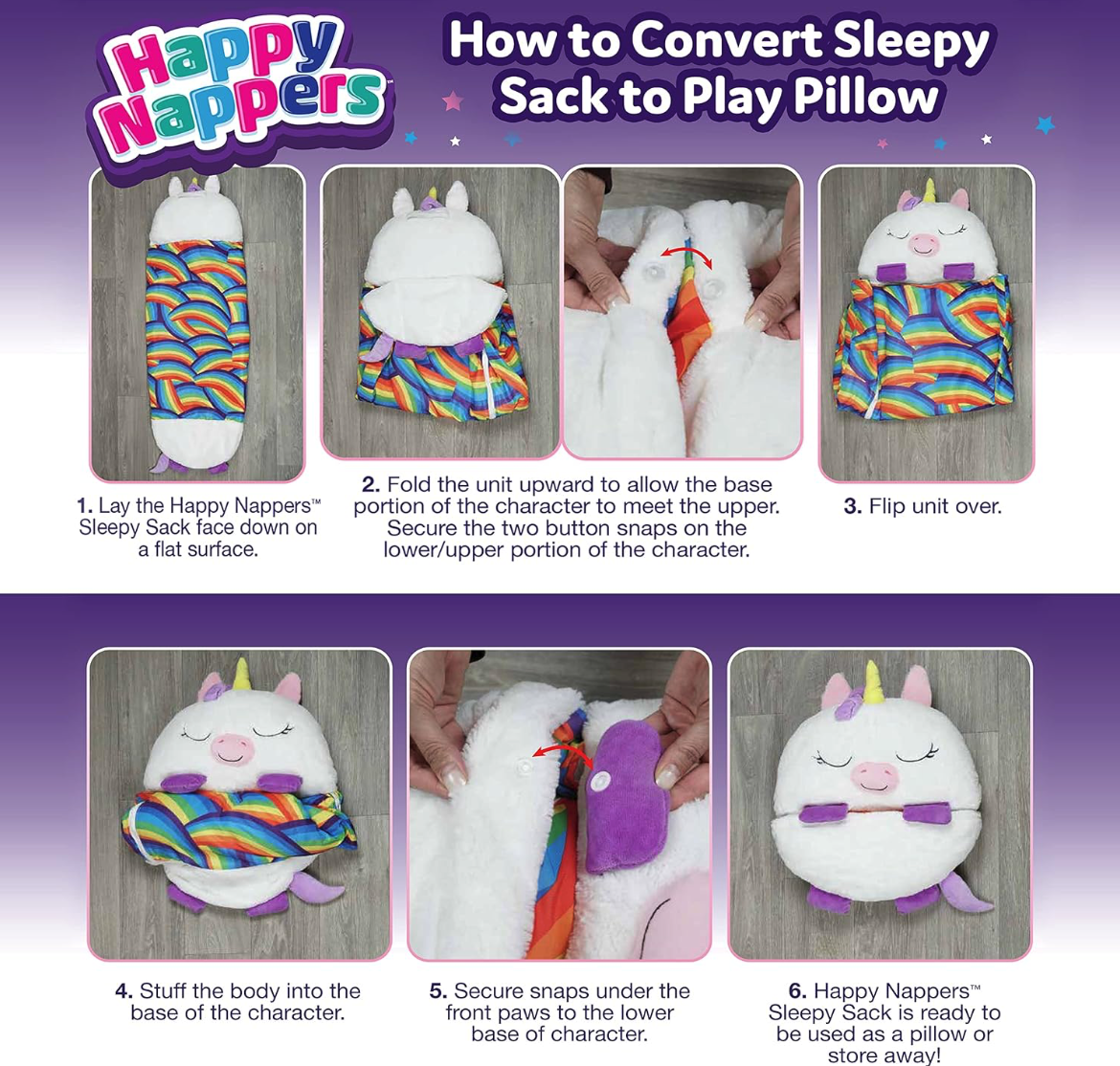 - PILLOW & SLEEPY SACK IN ONE – The perfect play pillow! When it’s time to sleep, just pull on their feet reveal a cozy sleepy sack. When napping is done, the sleepy sack easily folds back up and is secured by two button snaps and you can play again!