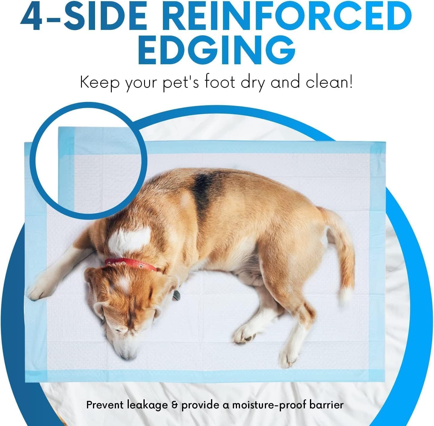 DISPOSABLE, QUICK-DRY & LEAKPROOF. Featuring the reinforced edging on 4 sides and its impenetrable barrier, our wee wee pads for dogs work great in preventing leakage through your flooring, sheets & furnitures. Its advance fast dry mechanism provides quick absorption, fast dry surface, and a moisture-proof anti-slip backing.