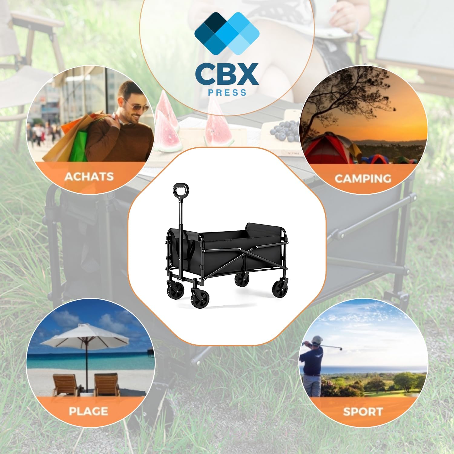 Equipped with rugged all-terrain wheels, this collapsible wagon cart glides over grass, sand, gravel, and pavement. The 360° rotating front wheels provide smooth steering, making it the perfect beach wagon, garden cart, or sports utility cart for outdoor use. This heavy-duty foldable wagon cart sets up in seconds and folds compactly for easy storage. Fits in car trunks, closets, garages, or RVs. A reliable rolling cart with wheels for groceries, travel, or camping essentials, offering convenience wherever you go. The adjustable ergonomic handle ensures a comfortable grip for effortless pulling and pushing. Perfect as a grocery cart, shopping trolley, or foldable utility cart for daily errands, outdoor trips, or kids’ activities — making every task easier. Simplify heavy loads with this foldable utility wagon — built with 220 lbs. capacity, sturdy steel frame, compact design, all-terrain wheels, and water-resistant fabric. Ideal as a camping wagon, beach cart, garden cart, kids wagon, or shopping cart with wheels.