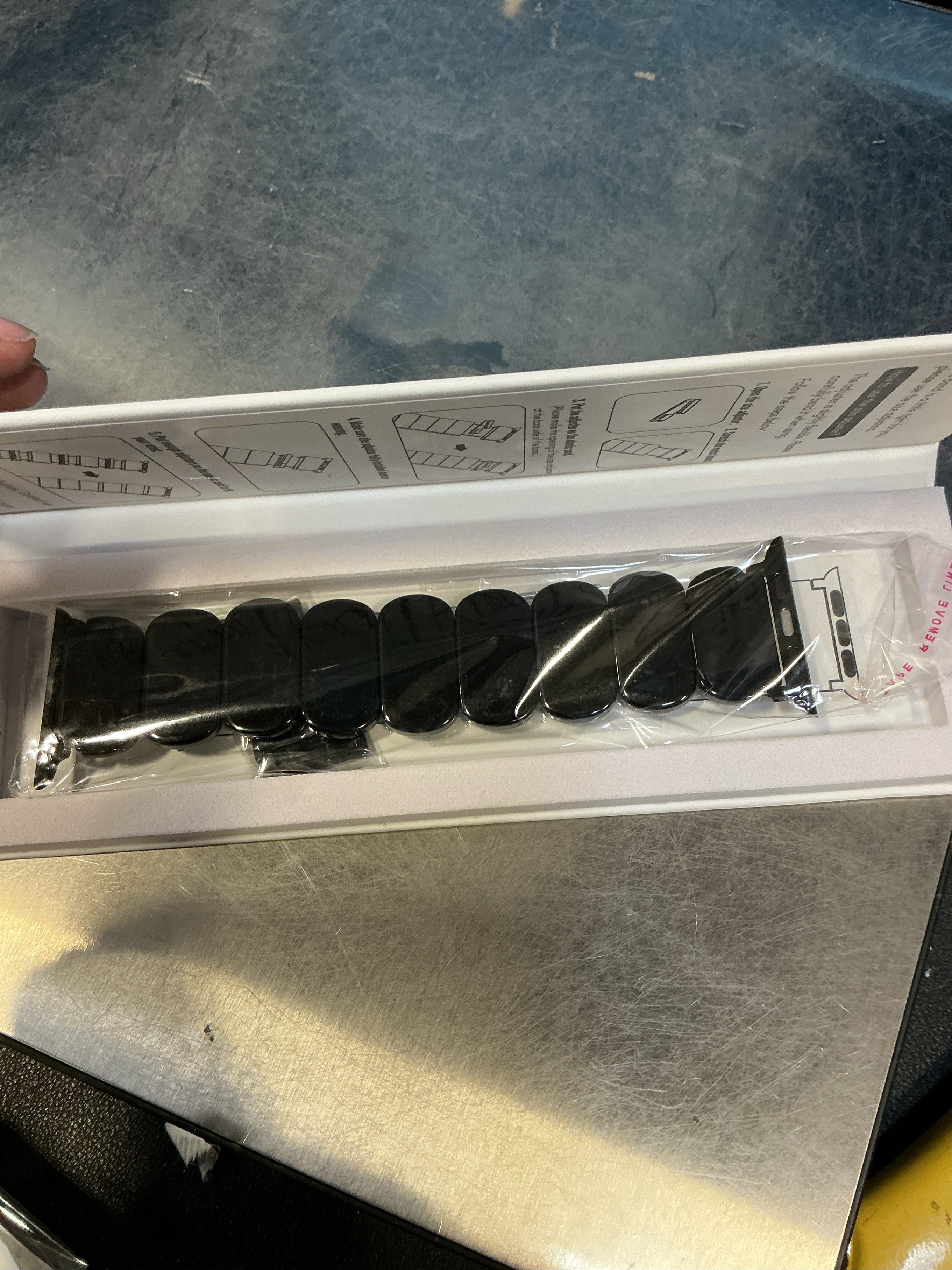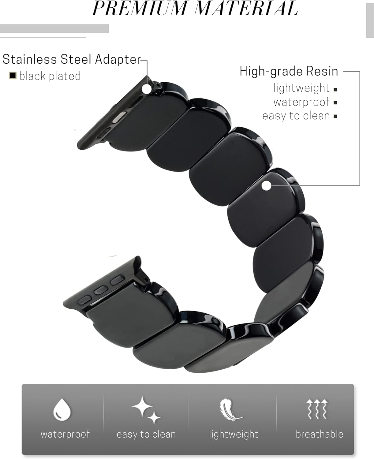[Premium Material] – The Band is made of high-end resin material called acetate, which is high-polished, lightweight, shimmery and exquisite. It’s vibrant color won't fade over time. The watchband adapter is made of long lasting black-plated stainless steel. The resin pieces are connected by strong elastic cord which is flexible, sturdy and durable.