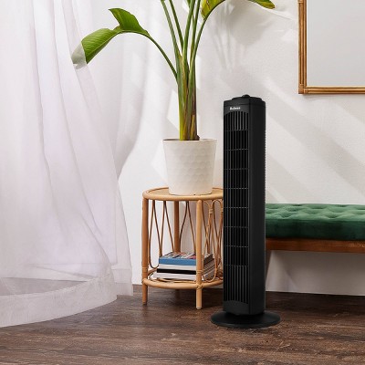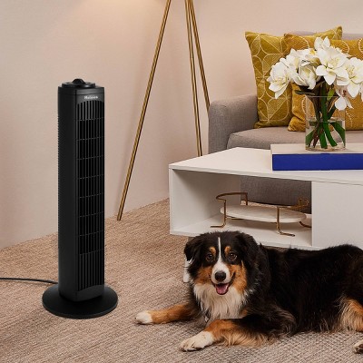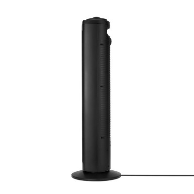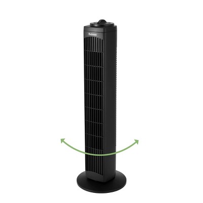 Holmes 29" Manual Tower Fan makes cooling your home a breeze. It features an easy-to-use manual control knob to operate the fan and adjust the settings. Includes 3 speed options, low, medium and high, with up to 18 ft./sec. High-speed velocity and motorized 80 oscillation delivers cool airflow for wider areas. This slim, compact tower fan is ideal for areas where floor space is limited; including bedrooms, kitchens, living rooms and home offices, and has an integrated carrying handle to easily move from one room to the next. Features a matte black finish and is ETL certified. Highlights: Easy-to-use manual control knob 3 speeds for customized cooling comfort Motorized 80 wide angle oscillation Quiet operation with only 60 decibels on the strongest speed setting Ideal for your bedroom, living room, kitchen or home office Integrated carry handle Matte black finish ETL certified Specifications: Dimensions (Overall): 29 Inches (H) x 9.05 Inches (W) x 9.05 Inches (D) Weight: 6 Pounds Features: Oscillating, Air Circulation Cable/Cord Length: 6 Feet Assembly Details: Adult Assembly Required, No Tools Needed Number of Speeds: 3 Industry or Government Certifications: ETL Listed, UL Listed Room Size Range: 100-300 sq. Ft. Assembled Blade Diameter: 3.5 Inches Material: Plastic Power Source: Electric Battery: No Battery Used