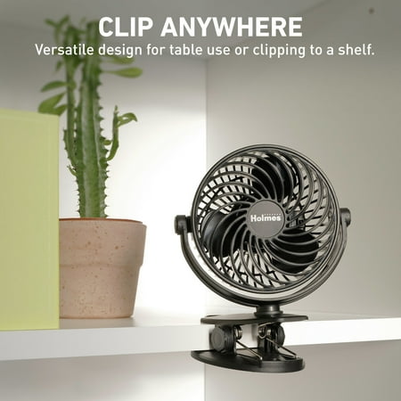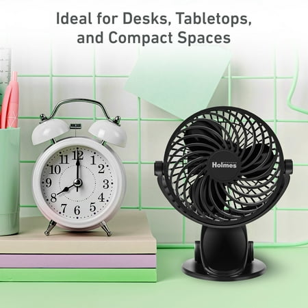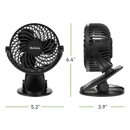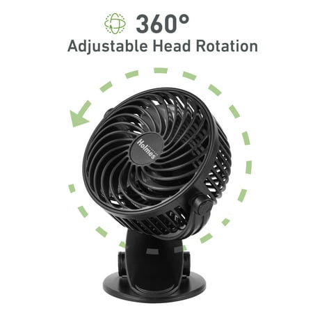 Holmes 4” Rechargeable Clip Fan, 360° Tilt, Strong Airflow, USB, Long Battery, Black no