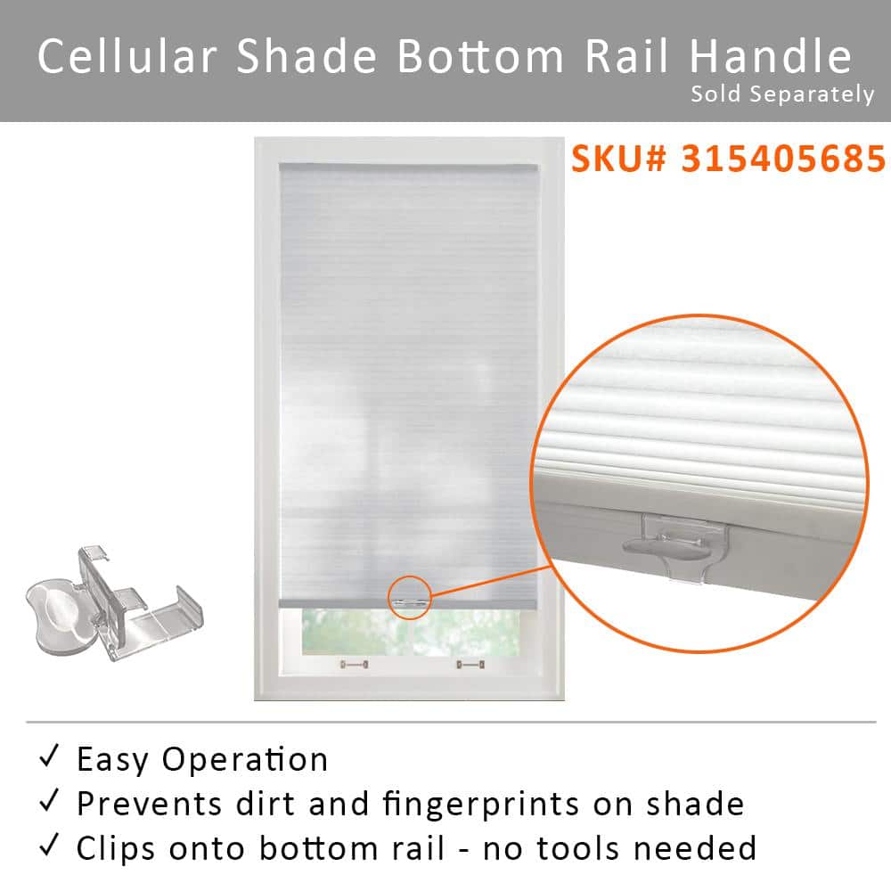 The Home Decorators Collection Cordless Blackout Cellular Shade provides privacy and insulation to your window. The energy efficient fabric design provides optimal room darkening and privacy. The cellular shade's honeycomb construction creates air chambers that insulate and shield your room from the outside heat or cold. This unique feature helps lower your heating or cooling bills all year round. The cordless shade's honeycomb-shaped cells are made with durable, spun lace fabric that form crisp, clean pleats that will keep your windows looking sleek. This cordless shade operates without any visible cords, providing a safe environment for children and pets.. Honeycomb cellular shades provide insulation & reduce energy cost. Blackout shades provide the best level of light control & privacy. Cordless shades are safer for children and pets. Actual cellular shade width measures 29.5 in. due to a 0.25 in. deduction at the factory to ensure a proper fit on the window or door frame. For an inside mount, cellular shade fits windows: 29.75 in. W. For an outside mount, add approximately 4 in. to the width of cellular shade (2 in. each side) and height for optimum light control and privacy. Shades include hardware, mounting and hold down brackets and headrail for easy installation. The cordless function for the cellular shade eliminates unsightly cords, allowing for a child and pet safe alternative. Cordless blackout cellular shade is made of soft and durable spun lace fabric, blocking out light and provides the highest level of privacy. Celluar shade features a white backing for clean street side apperance. Preview 3D-Animated Interactive Instructions for easy Assembly & Operation". Cordless Cellular Light Filtering and Blackout Bottom Rail Handle. Not sure what size to buy? Click here to download a printable window treatment measuring guide!". Click here to learn more about exclusive Home Decorators Collection products". Cell layers: Single Headed. Color Family: White. Color/Finish: Shadow White. Control Type: N/A. Decor Type: Window Treatment. Enclosure Type: Mounted Frame. Features: Fade resistant,Trimmable width. Front Color: White. Included: Installation/Mounting Hardware. Lift Systems: Cordless. Light Control: Blackout. Material: Polyester. Material: Polyester (100%). Mount Type: Inside/Outside Mount. Opening type: Bottom up. Orientation: Horizontal. Origin: Imported. Pre-Cut Deduction (in.): 0.25. Product Weight (lb.): 2.27 lb. Shade/Motor: Shade Only. Shop Type: Pre-Cut. Style: Modern. Surface: Smooth. Window Treatment Product Type: Cellular Blind/Shade. Actual Blind/Shade Width (In.): 29.5. Approx. Cell Width (In.): 9/16 in.. Cell width (in.): 1.5 in. Minimum window depth required (in.): 1.61 in. Pre-Cut or True-to-Size Blind: Pre-cut. Product Depth (in.): 0.56 in. Product Height (in.): 48 in. Product Length (in.): 48 in. Product Width (in.): 29.75 in. Width (in) x Length (in): 29.75in x 48 in