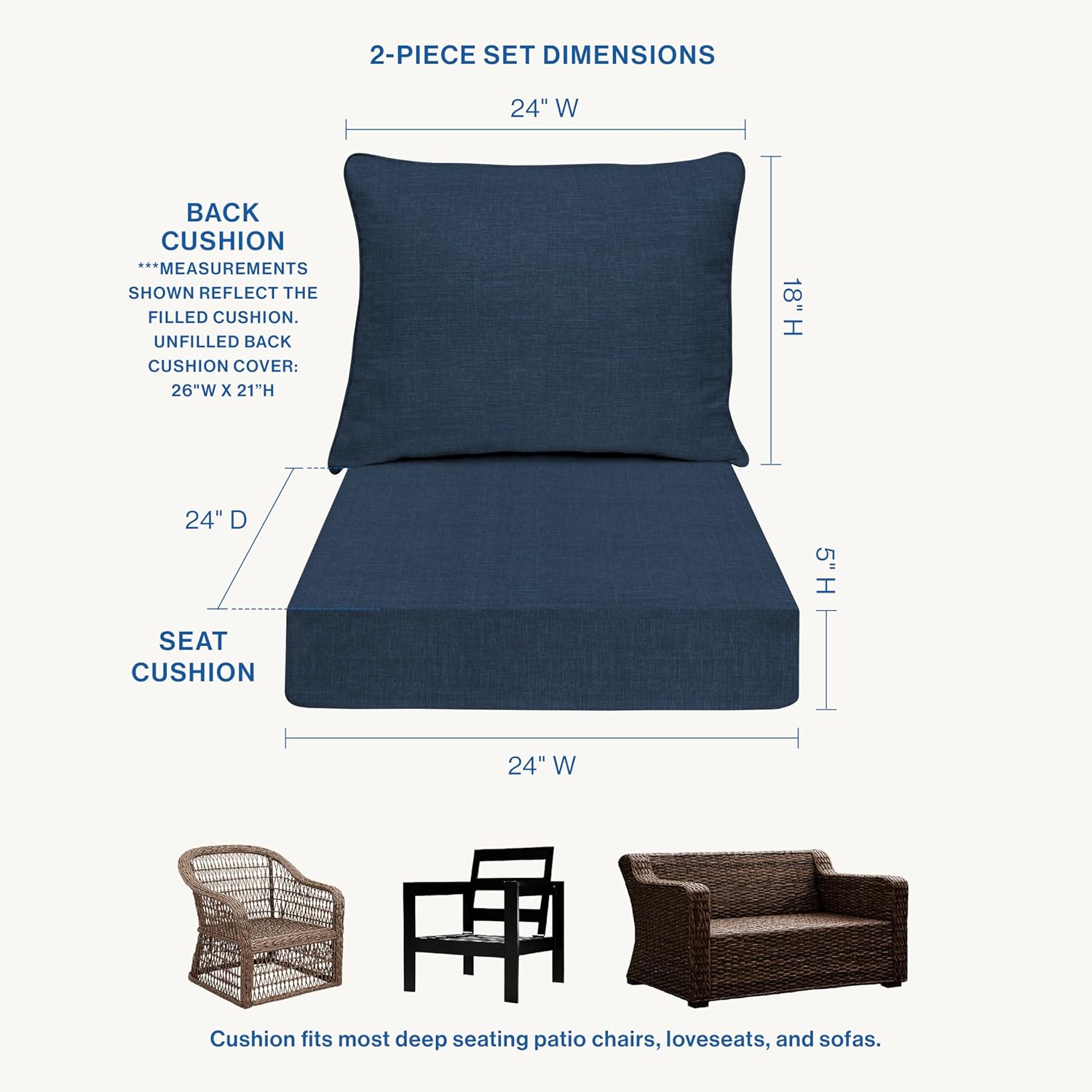 Honeycomb Outdoor Essentials Deep Seat, 24 x 24, Hampton Texture Navy Chair Cushion for Patio Furniture