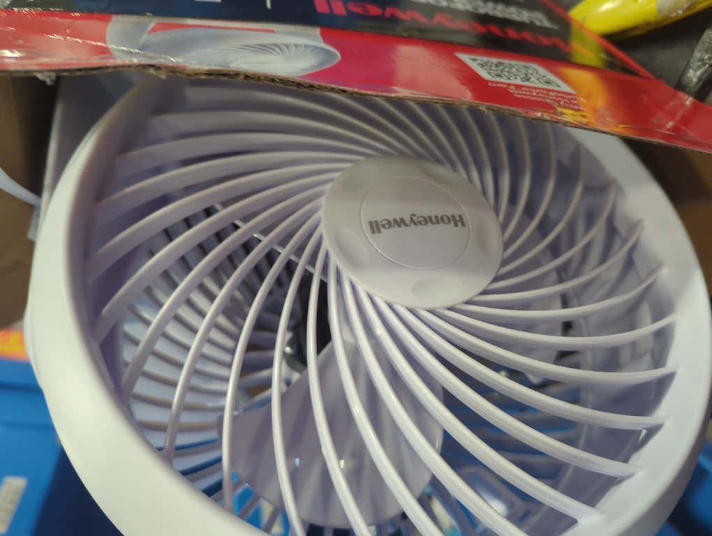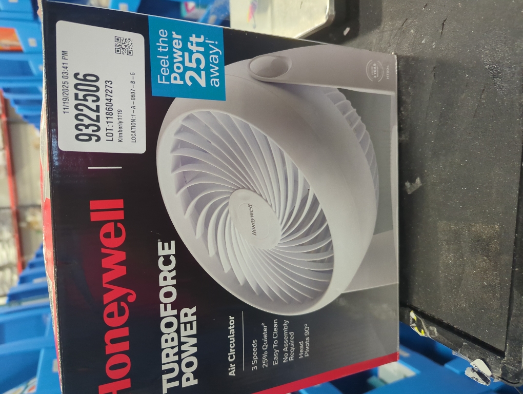 The 3-speed Honeywell HT-904 TurboForce Air Circulator provides a quiet and efficient means of cooling a surrounding area. The HT-904 is 25 percent quieter than its competitors and represents a superior selection for those seeking a relatively noiseless experience when it comes to emitting large amounts of cool air. An adjustable fan head is fully capable of pivoting and reaching a 90-degree angle that can be used for direct cooling or circulating the air. Maximum air distribution is achieved via the inclusion of an Aerodynamic Turbo Design. This fan's small size and efficient output opens a wealth of installation options in the home, office, or dorm setting. The availability of three selectable speeds carries the bonus of potentially reducing energy expenses. The TurboForce Air Circulator Fan can be used for personal or powerful directional cooling. Feel the blast of the TurboForce Power Air Circulator Fan from 25 ft. away. These portable fans' 3-speed settings and 90-degree pivoting head are designed to work with the cooling and heating in your home to create a custom comfort zone. Uniquely engineered fan blades provide quiet, powerful personal cooling that is great on a tabletop or mounted to the wall in your home or office.