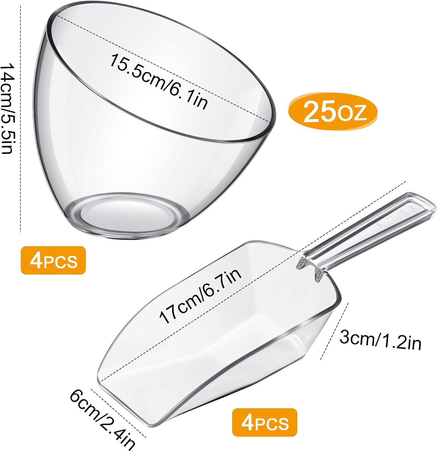 Serving Bowl with Scoop Set: you will get 4 pieces of 700 ml clear plastic bowls and 4 pieces of ice scoops which can hold up 1/3 cup, sufficient quantity and nice combination to meet your daily use and replacements; You can share them with your friends and family members to use; The detailed dimensions are shown in the picture
