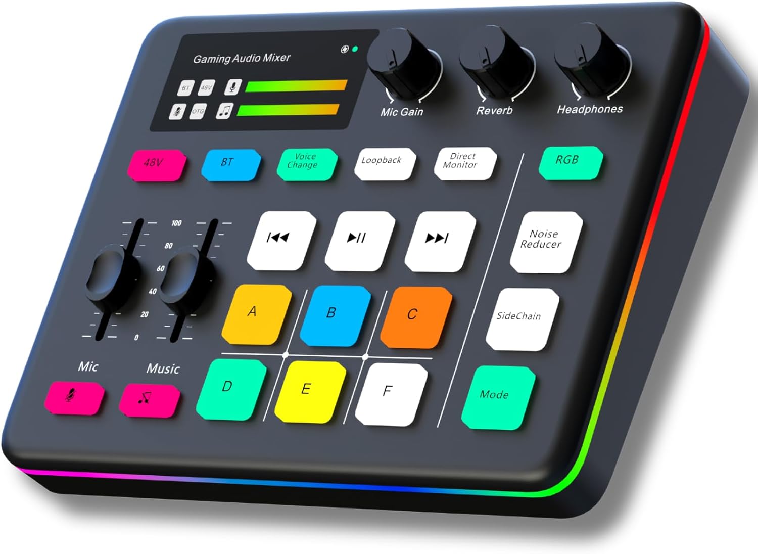 HOSONGIN Gaming Audio Mixer, Audio Interface with Pro-preamp, Voice Changer & DJ Mixer Effects, 48V Phantom Power, Bluetooth & RGB Live Sound Card for Streaming, Podcasting, Gaming