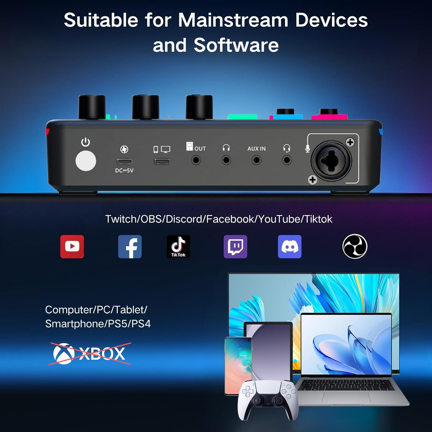 ???? Ultimate compatibility: DJ equipment is designed to work seamlessly with PCs, Macs, smartphones, and tablets. Whether you're just beginning your streaming journey or already a pro, this recording studio equipment ensures hassle-free audio connections every time. Simple to use and good for newcomers, this device transforms your setup into a professional studio with just one plug.