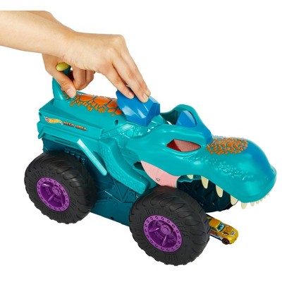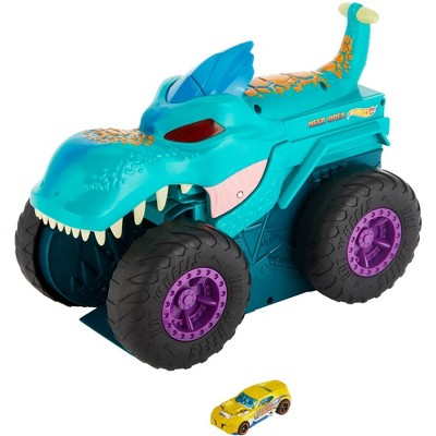 The enormous Hot Wheels Monster Trucks Car Chompin' Mega Wrex vehicle comes to life with lights and sounds! Push his tail and Mega Wrex will chow down on 1:64 scale die-cast cars and Hot Wheels Monster Trucks. This fan-favorite monster truck playset is a must-have for kids 3 years old and older. Not only does it include amazing sound effects and lights—after it eats vehicles it poops them out! Includes one Hot Wheels die-cast car. Kids can experience the thrill of crashing and smashing fun and add this outrageous set to their world of Monster Trucks. Each sold separately, subject to availability. Colors and decorations may vary.