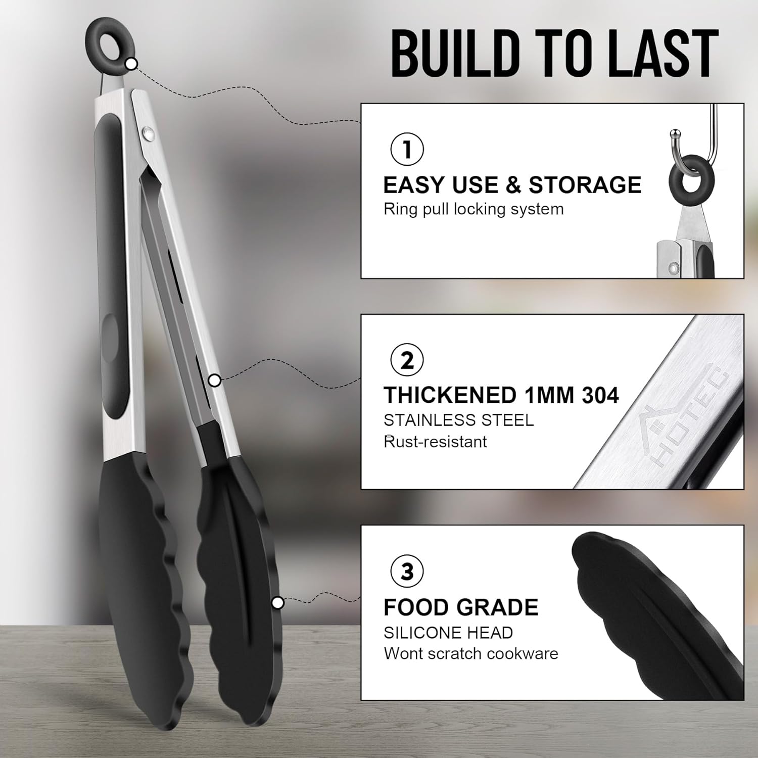TOP QUALITY: Hotec kitchen tongs are constructed with high quality stainless steel, sturdy, heat resistance, anti-rust, anti-corrosion, light weight, easy to handle, like new forever. This tongs for cooking comes with 2 sizes, 9 inch and 12 inch. Food safe, Carbonfree Certified.