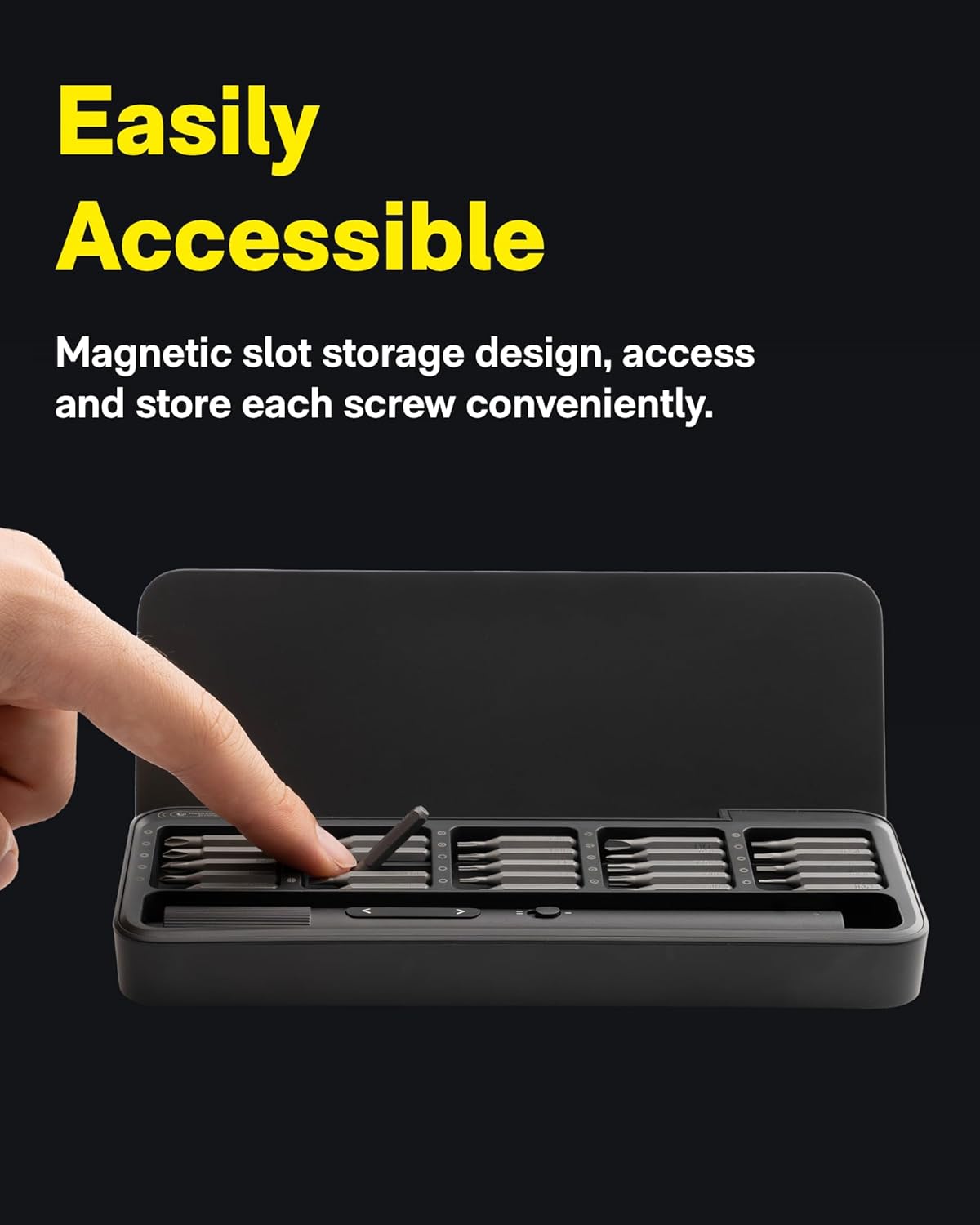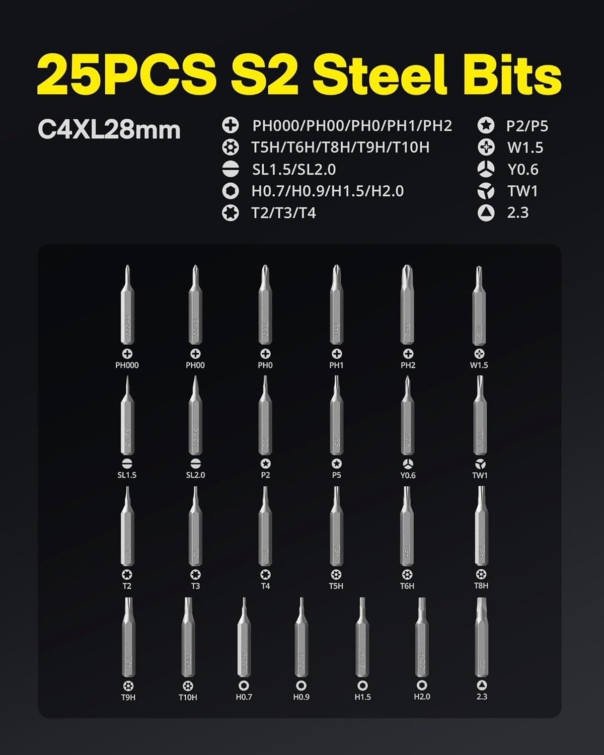 Faster, Smarter, Professional – This 25-in-1 mini electric screwdriver includes 25 durable S2 bits in 10 essential types. Equipped with a 360° shadowless LED light and dual torque settings, it ensures precise performance in every repair task. USB-C charging with 350mAh lithium-ion battery offers long-lasting power and true cordless convenience