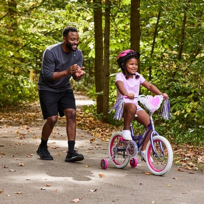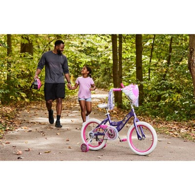 Your royal carriage awaits! This 16-inch Disney Princess bike for girls is a great first (or upgraded!) bike. Lovers of the Disney Princess crew will certainly delight in this beautiful bike with training wheels. The durable purple steel frame is designed with shimmering floral details and, of course, features beloved princesses! In addition to the frame design, this bike also features fun accessories like the shiny streamers and the heart-shaped handlebar basket so she can bring whatever she needs on her next royal adventure. This bike doesn’t just boast good looks, but also great features that can help mom and dad feel confident that your rider is safe! The stable training wheels help your girl ride confidently and can be removed when she’s ready for just 2 wheels. The coaster brake is easy to engage so she can control her speed, and the saddle and grips keep her comfortable throughout her ride. Certainly no pumpkin here!